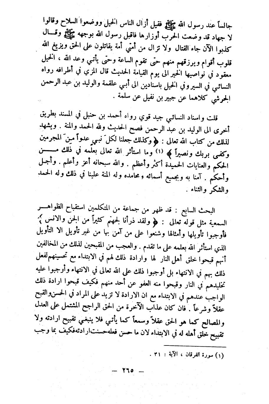 الْبَحْث السَّابِع قد ظهر من جمَاعَة من الْمُتَكَلِّمين استقباح الظَّوَاهِر السمعية مثل قَوْله تَعَالَى {وَلَقَد ذرأنا لِجَهَنَّم كثيرا من الْجِنّ وَالْإِنْس} فأوجبوا تَأْوِيلهَا وأمثالها وشنعوا على من آمن بهَا من غير تَأْوِيل الا التَّأْوِيل الَّذِي اسْتَأْثر الله بِعِلْمِهِ على مَا تقدم وَالْعجب من المقبحين لذَلِك من الْمُخَالفين أَنهم قبحوا خلق أهل النَّار لَهَا وارادة ذَلِك لَهُم فِي الِابْتِدَاء مَعَ تحسينهم لفعل ذَلِك بهم فِي الِانْتِهَاء بل أوجبوا ذَلِك على الله تَعَالَى فِي الِانْتِهَاء وأوجبوا عَلَيْهِ تخليدهم فِي النَّار وقبحوا مِنْهُ الْعَفو عَن أحد مِنْهُم فَكيف قبحوا ارادة ذَلِك الْوَاجِب عِنْدهم فِي الِابْتِدَاء مَعَ ان الارادة لَا تزيد على المُرَاد فِي الْحسن والقبح عقلا وَشرعا فان كَانَ عَذَاب الْآخِرَة من الْحق الرَّاجِح الْمُشْتَمل على الْعدْل والمصالح كَمَا هُوَ الْحق عقلا وسمعا كَمَا يَأْتِي فَلَا يَنْبَغِي تقبيح ارادته وَلَا تقبيح خلق أَهله لَهُ فِي الِابْتِدَاء لَان مَا حسن فعله حسنت ارادته فَكيف بِمَا وَجب