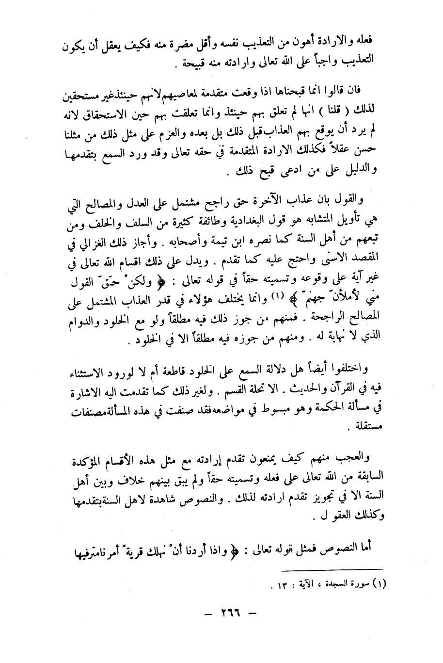 وَالْقَوْل بَان عَذَاب الْآخِرَة حق رَاجِح مُشْتَمل على الْعدْل والمصالح الَّتِي هِيَ تَأْوِيل الْمُتَشَابه هُوَ قَول البغدادية وَطَائِفَة كَثِيرَة من السّلف وَالْخلف وَمن تَبِعَهُمْ من أهل السّنة كَمَا نَصره ابْن تيمة وَأَصْحَابه وَأَجَازَ ذَلِك الْغَزالِيّ فِي الْمَقْصد الاسنى وَاحْتج عَلَيْهِ كَمَا تقدم وَيدل على ذَلِك اقسام الله تَعَالَى فِي غير آيَة على وُقُوعه وتسميته حَقًا فِي قَوْله تَعَالَى {وَلَكِن حق القَوْل مني لأملأن جَهَنَّم} وانما يخْتَلف هَؤُلَاءِ فِي قدر الْعَذَاب الْمُشْتَمل على الْمصَالح الراجحة فَمنهمْ من جوز ذَلِك فِيهِ مُطلقًا وَلَو مَعَ الخلود والدوام الَّذِي لَا نِهَايَة لَهُ وَمِنْهُم من جوزه فِيهِ مُطلقًا الا فِي الخلود