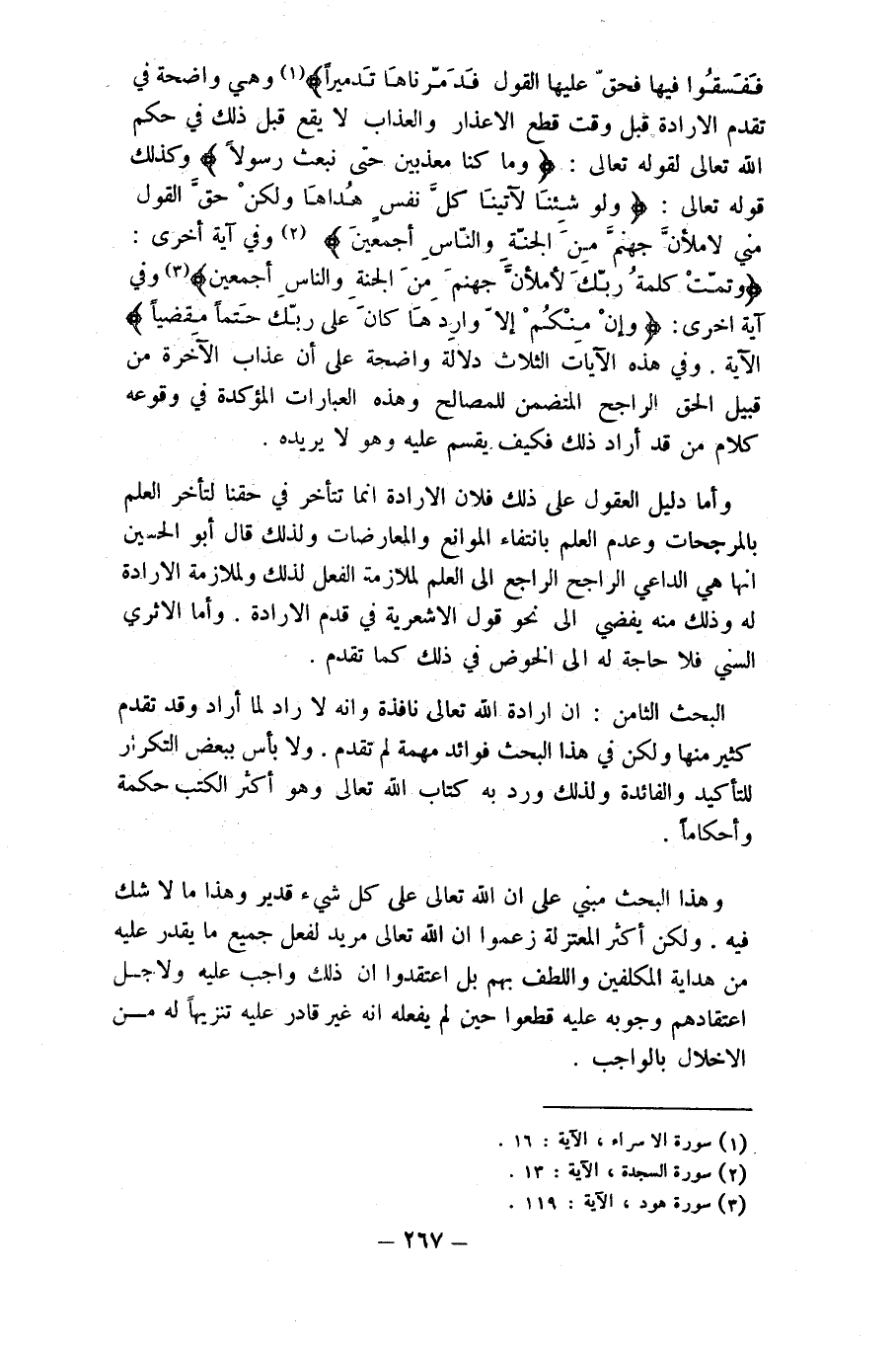 ) وَهِي وَاضِحَة فِي تقدم الارادة قبل وَقت قطع الاعذار وَالْعَذَاب لَا يَقع قبل ذَلِك فِي حكم الله تَعَالَى لقَوْله تَعَالَى {وَمَا كُنَّا معذبين حَتَّى نبعث رَسُولا} وَكَذَلِكَ قَوْله تَعَالَى {وَلَو شِئْنَا لآتينا كل نفس هداها وَلَكِن حق القَوْل مني لأملأن جَهَنَّم من الْجنَّة وَالنَّاس أَجْمَعِينَ} وَفِي آيَة أُخْرَى {وتمت كلمة رَبك لأملأن جَهَنَّم من الْجنَّة وَالنَّاس أَجْمَعِينَ} وَفِي آيَة اخرى {وَإِن مِنْكُم إِلَّا واردها كَانَ على رَبك حتما مقضيا} الاية وَفِي هَذِه الْآيَات الثَّلَاث دلَالَة وَاضِحَة على أَن عَذَاب الاخرة من قبيل الْحق الرَّاجِح المتضمن للْمصَالح وَهَذِه الْعبارَات الْمُؤَكّدَة فِي وُقُوعه كَلَام من قد أَرَادَ ذَلِك فَكيف يقسم عَلَيْهِ وَهُوَ لَا يُريدهُ