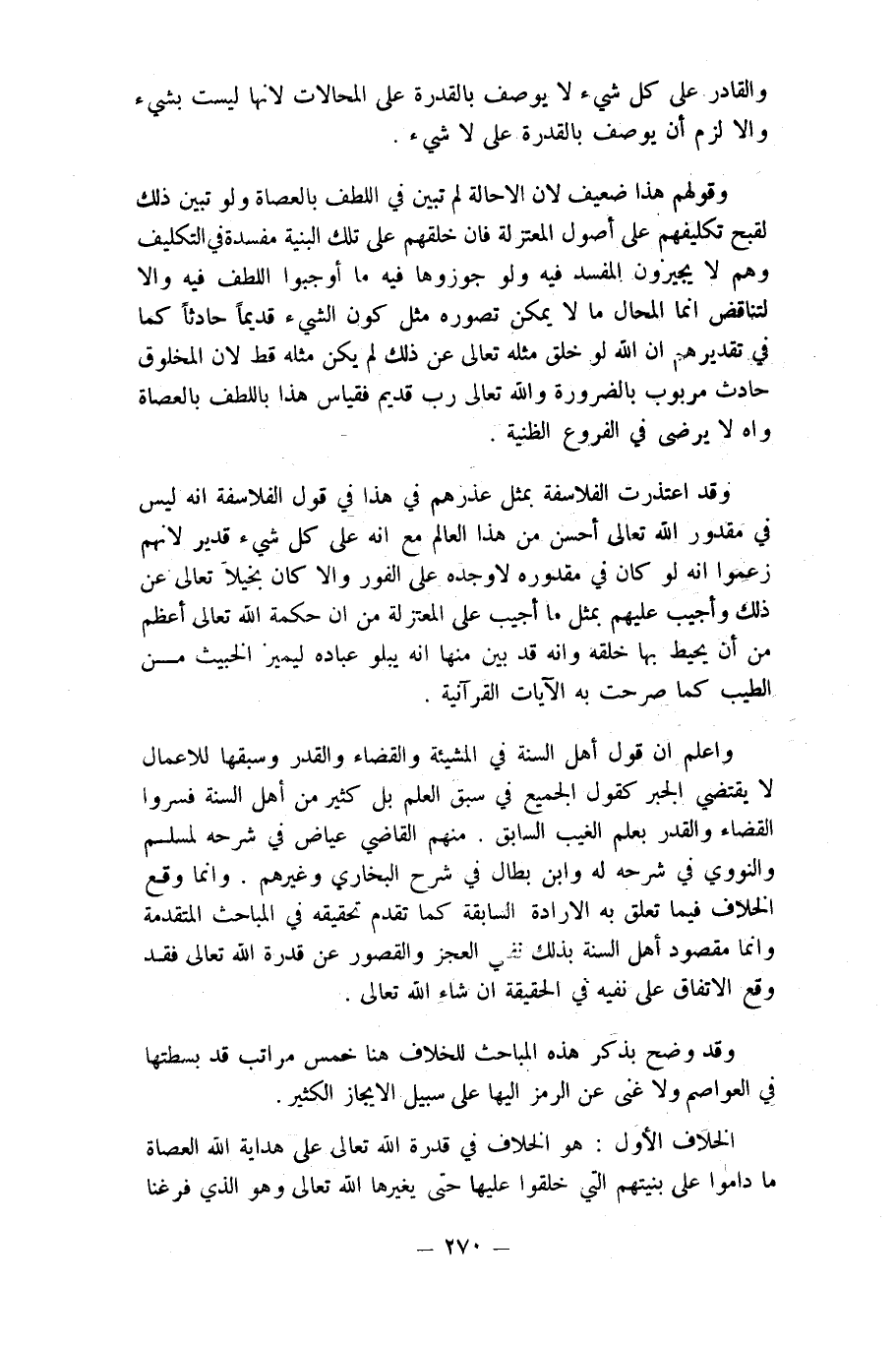 وَاعْلَم ان قَول أهل السّنة فِي الْمَشِيئَة وَالْقَضَاء وَالْقدر وسبقها للاعمال لَا يَقْتَضِي الْجَبْر كَقَوْل الْجَمِيع فِي سبق الْعلم بل كثير من أهل السّنة فسروا الْقَضَاء وَالْقدر بِعلم الْغَيْب السَّابِق مِنْهُم القَاضِي عِيَاض فِي شَرحه لمُسلم وَالنَّوَوِيّ فِي شَرحه لَهُ وَابْن بطال فِي شرح البُخَارِيّ وَغَيرهم وانما وَقع الْخلاف فِيمَا تعلق بِهِ الارادة السَّابِقَة كَمَا تقدم تَحْقِيقه فِي المباحث الْمُتَقَدّمَة وانما مَقْصُود أهل السّنة بذلك نفي الْعَجز والقصور عَن قدرَة الله تَعَالَى فقد وَقع الِاتِّفَاق على نَفْيه فِي الْحَقِيقَة ان شَاءَ الله تَعَالَى