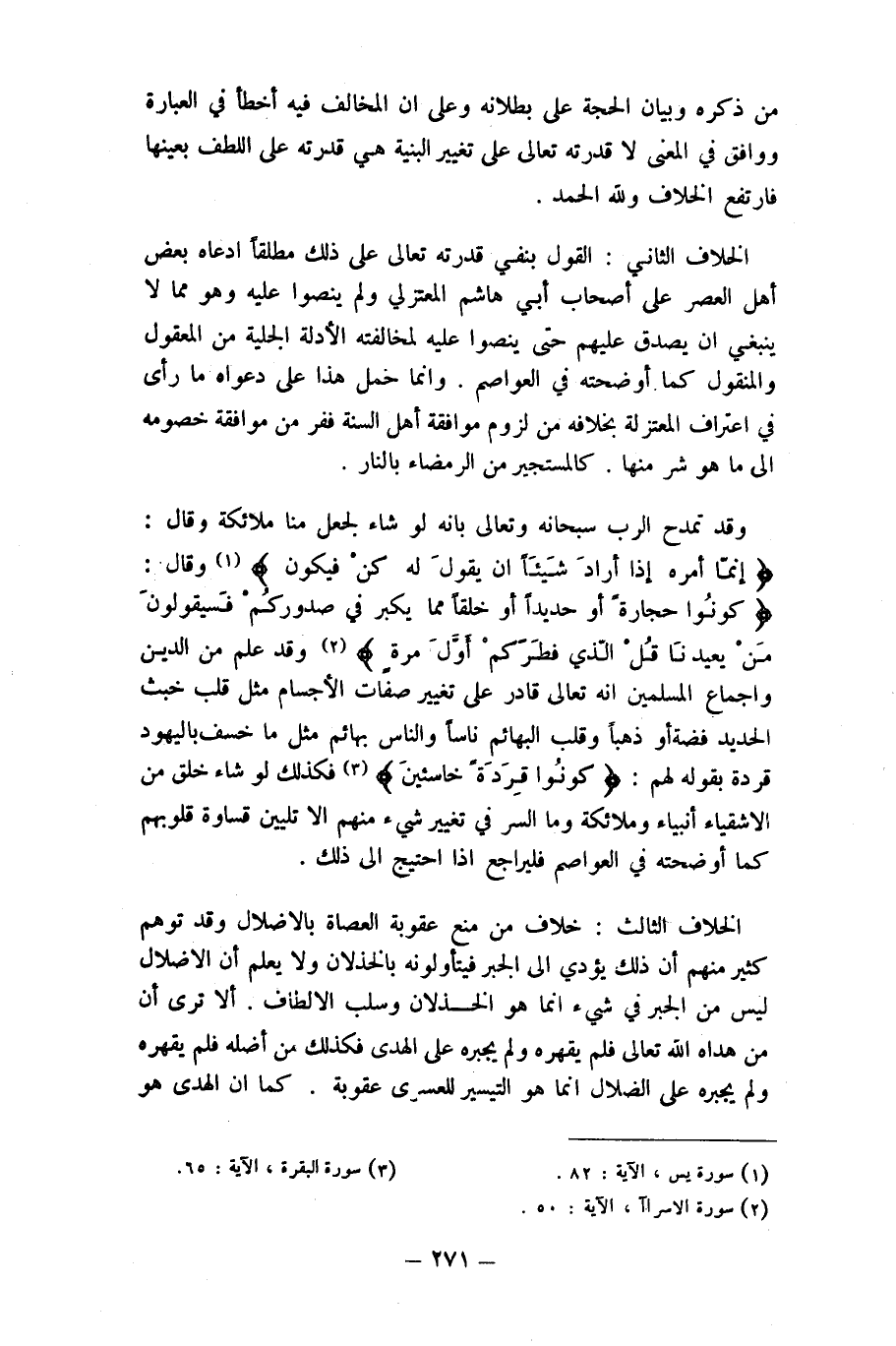 من ذكره وَبَيَان الْحجَّة على بُطْلَانه وعَلى ان الْمُخَالف فِيهِ أَخطَأ فِي الْعبارَة وَوَافَقَ فِي الْمَعْنى لَا قدرته تَعَالَى على تَغْيِير البنية هِيَ قدرته على اللطف بِعَينهَا فارتفع الْخلاف وَللَّه الْحَمد