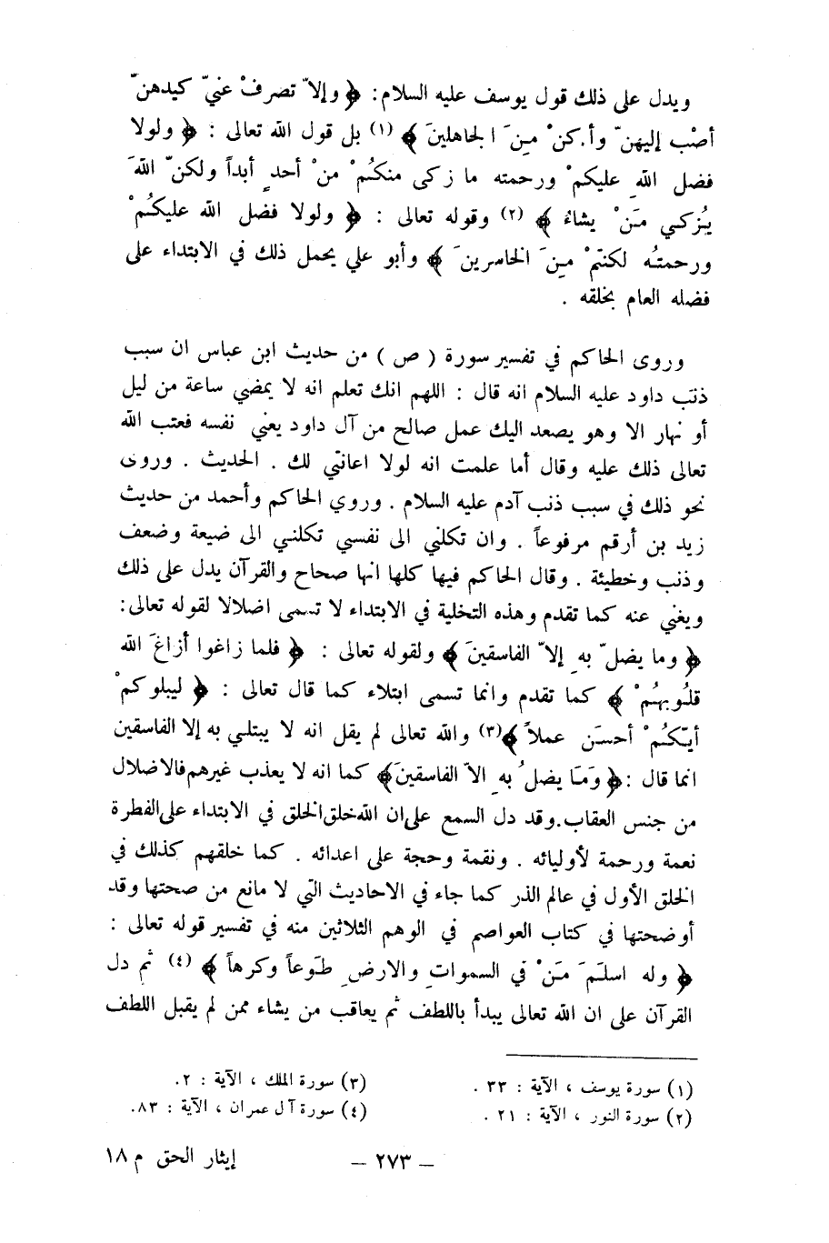وَيدل على ذَلِك قَول يُوسُف عَلَيْهِ السَّلَام {وَإِلَّا تصرف عني كيدهن أصب إلَيْهِنَّ وأكن من الْجَاهِلين} بل قَول الله تَعَالَى {وَلَوْلَا فضل الله عَلَيْكُم وَرَحمته مَا زكا مِنْكُم من أحد أبدا وَلَكِن الله يُزكي من يَشَاء} وَقَوله تَعَالَى {فلولا فضل الله عَلَيْكُم وَرَحمته لكنتم من الخاسرين} وَأَبُو عَليّ يحمل ذَلِك فِي الِابْتِدَاء على فَضله الْعَام بخلقه