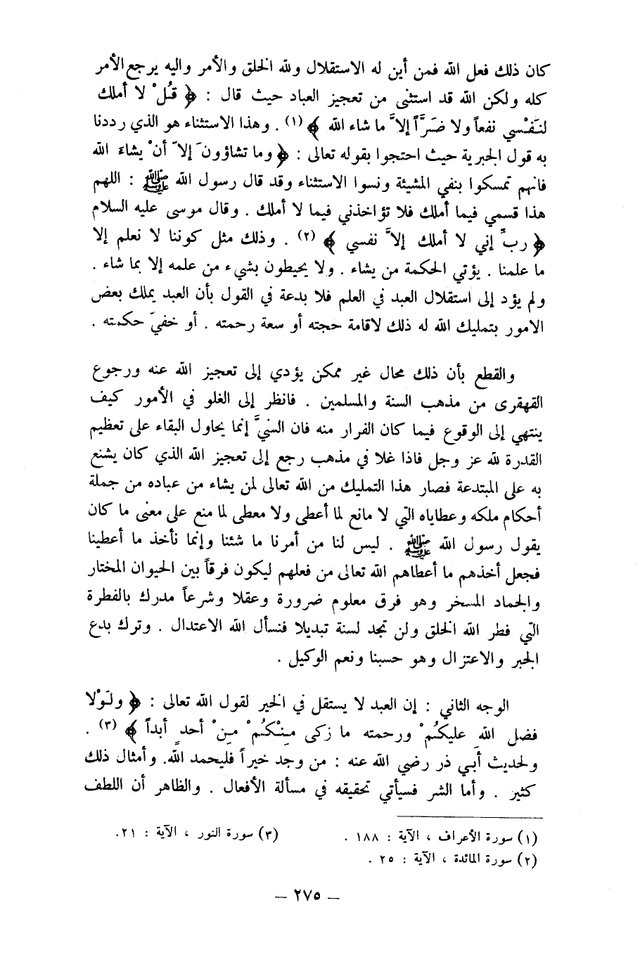 كَانَ ذَلِك فعل الله فَمن أَيْن لَهُ الِاسْتِقْلَال وَللَّه الْخلق وَالْأَمر واليه يرجع الْأَمر كُله وَلَكِن الله قد اسْتثْنى من تعجيز الْعباد حَيْثُ قَالَ {قل لَا أملك لنَفْسي نفعا وَلَا ضرا إِلَّا مَا شَاءَ الله} وَهَذَا الِاسْتِثْنَاء هُوَ الَّذِي رددنا بِهِ قَول الجبرية حَيْثُ احْتَجُّوا بقوله تَعَالَى {وَمَا تشاؤون إِلَّا أَن يَشَاء الله} فانهم تمسكوا بِنَفْي الْمَشِيئَة ونسوا الِاسْتِثْنَاء وَقد قَالَ رَسُول الله صلى الله عَلَيْهِ وَسلم (اللَّهُمَّ هَذَا قسمي فِيمَا أملك فَلَا تؤاخذني فِيمَا لَا أملك وَقَالَ مُوسَى عَلَيْهِ السَّلَام {رب إِنِّي لَا أملك إِلَّا نَفسِي} وَذَلِكَ مثل كوننا لَا نعلم إِلَّا مَا علمنَا يُؤْتِي الْحِكْمَة من يَشَاء وَلَا يحيطون بِشَيْء من علمه إِلَّا بِمَا شَاءَ وَلم يؤد إِلَى اسْتِقْلَال العَبْد فِي الْعلم فَلَا بِدعَة فِي القَوْل بِأَن العَبْد يملك بعض الامور بِتَمْلِيك الله لَهُ ذَلِك لاقامة حجَّته أَو سَعَة رَحمته أَو خَفِي حكمته