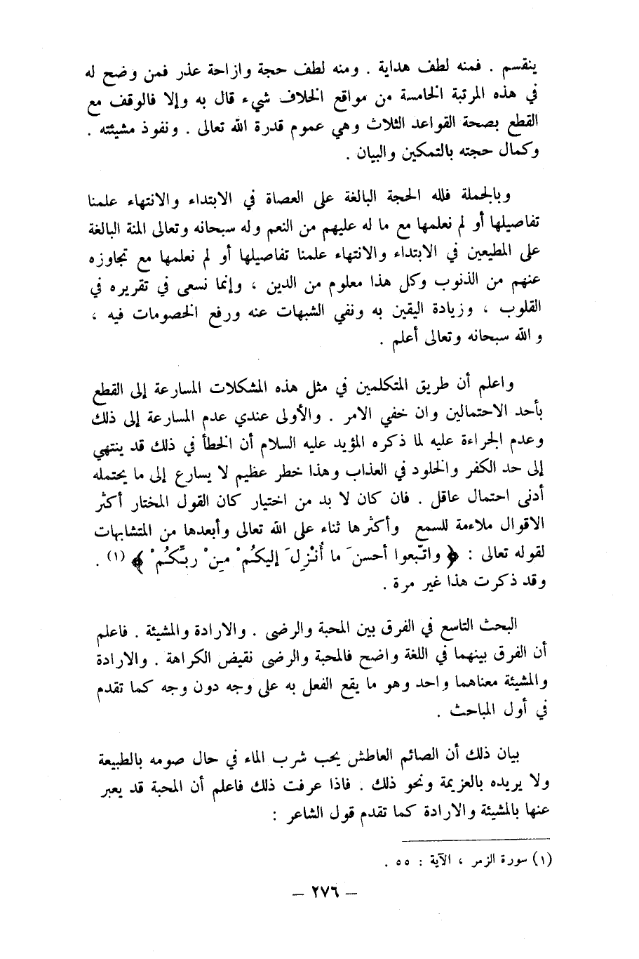 يَنْقَسِم فَمِنْهُ لطف هِدَايَة وَمِنْه لطف حجَّة وازاحة عذر فَمن وضح لَهُ فِي هَذِه الْمرتبَة الْخَامِسَة من مواقع الْخلاف شَيْء قَالَ بِهِ وَإِلَّا فالموقف مَعَ الْقطع بِصِحَّة الْقَوَاعِد الثَّلَاث وَهِي عُمُوم قدرَة الله تَعَالَى ونفوذ مَشِيئَته وَكَمَال حجَّته بالتمكين وَالْبَيَان