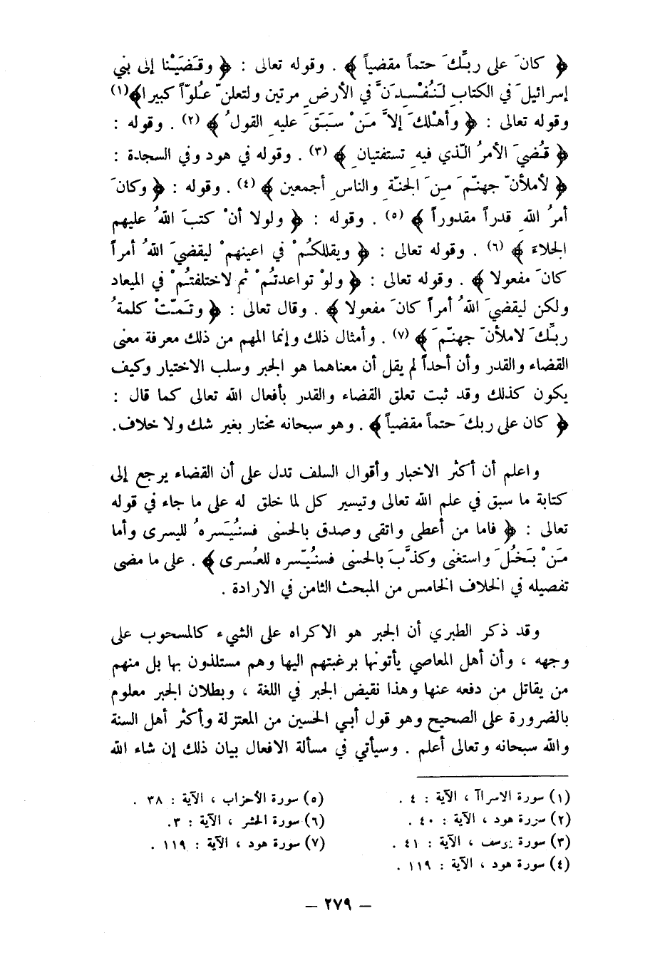 {كَانَ على رَبك حتما مقضيا} وَقَوله تَعَالَى {وقضينا إِلَى بني إِسْرَائِيل فِي الْكتاب لتفسدن فِي الأَرْض مرَّتَيْنِ ولتعلن علوا كَبِيرا} وَقَوله تَعَالَى {وَأهْلك إِلَّا من سبق عَلَيْهِ القَوْل} وَقَوله {قضي الْأَمر الَّذِي فِيهِ تستفتيان} وَقَوله فِي هود وَفِي السَّجْدَة {لأملأن جَهَنَّم من الْجنَّة وَالنَّاس أَجْمَعِينَ} وَقَوله {وَكَانَ أَمر الله قدرا مَقْدُورًا} وَقَوله {وَلَوْلَا أَن كتب الله عَلَيْهِم الْجلاء} وَقَوله تَعَالَى {ويقللكم فِي أَعينهم ليقضي الله أمرا كَانَ مَفْعُولا} وَقَوله تَعَالَى {وَلَو تواعدتم لاختلفتم فِي الميعاد وَلَكِن ليقضي الله أمرا كَانَ مَفْعُولا} وَقَالَ تَعَالَى {وتمت كلمة رَبك لأملأن جَهَنَّم} وأمثال ذَلِك وَإِنَّمَا المهم من ذَلِك معرفَة معنى الْقَضَاء وَالْقدر وَأَن أحدا لم يقل أَن مَعْنَاهُمَا هُوَ الْجَبْر وسلب الِاخْتِيَار وَكَيف يكون كَذَلِك وَقد ثَبت تعلق الْقَضَاء وَالْقدر بِأَفْعَال الله تَعَالَى كَمَا قَالَ {كَانَ على رَبك حتما مقضيا} وَهُوَ سُبْحَانَهُ مُخْتَار بِغَيْر شكّ وَلَا خلاف
