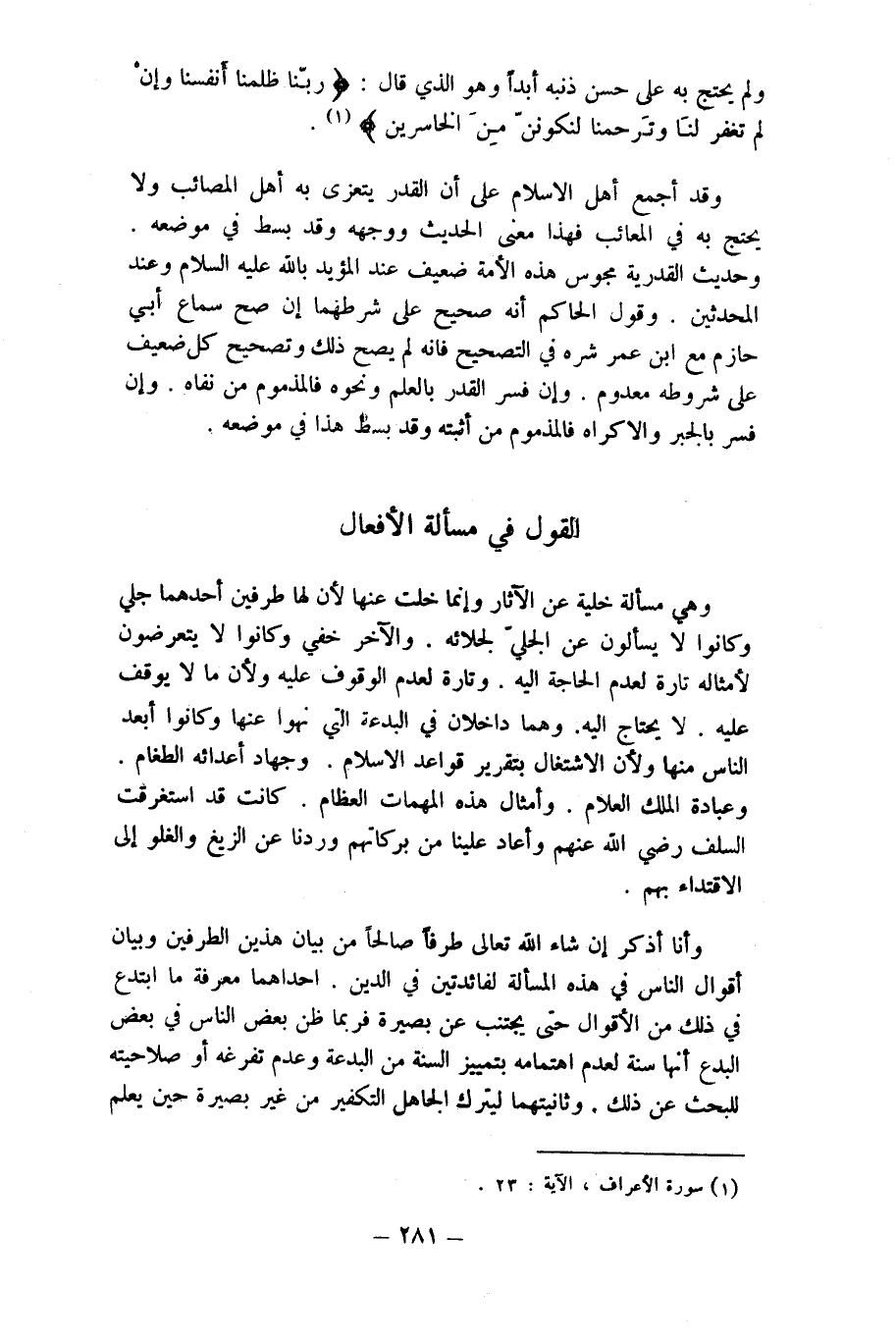 وَهِي مَسْأَلَة خلية عَن الْآثَار وَإِنَّمَا خلت عَنْهَا لِأَن لَهَا طرفين أَحدهمَا جلي وَكَانُوا لَا يسْأَلُون عَن الْجَلِيّ لجلائه وَالْآخر خَفِي وَكَانُوا لَا يتعرضون لأمثاله تَارَة لعدم الْحَاجة اليه وَتارَة لعدم الْوُقُوف عَلَيْهِ وَلِأَن مَا لَا يُوقف عَلَيْهِ لَا يحْتَاج اليه وهما داخلان فِي الْبِدْعَة الَّتِي نهوا عَنْهَا وَكَانُوا أبعد النَّاس مِنْهَا وَلِأَن الِاشْتِغَال بتقرير قَوَاعِد الاسلام وَجِهَاد أعدائه الطغام وَعبادَة الْملك العلام وأمثال هَذِه الْمُهِمَّات الْعِظَام كَانَت قد استغرقت السّلف رَضِي الله عَنْهُم وَأعَاد علينا من بركاتهم وردنا عَن الزيغ والغلو إِلَى الِاقْتِدَاء بهم