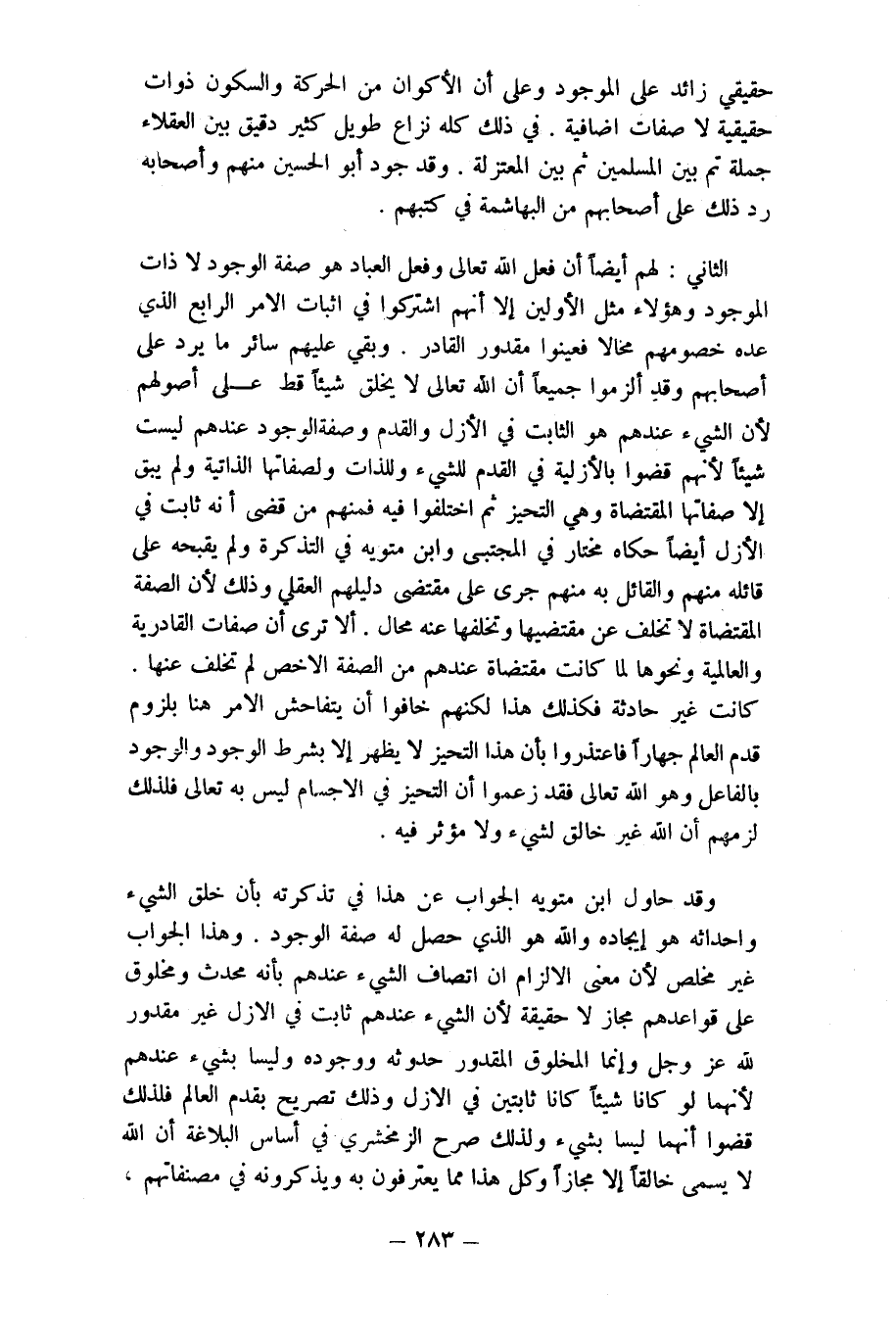 حَقِيقِيّ زَائِد على الْمَوْجُود وعَلى أَن الأكوان من الْحَرَكَة والسكون ذَوَات حَقِيقِيَّة لَا صِفَات اضافية فِي ذَلِك كُله نزاع طَوِيل كثير دَقِيق بَين الْعُقَلَاء جملَة تمّ بَين الْمُسلمين ثمَّ بَين الْمُعْتَزلَة وَقد جود أَبُو الْحُسَيْن مِنْهُم وَأَصْحَابه رد ذَلِك على أَصْحَابهم من البهاشمة فِي كتبهمْ