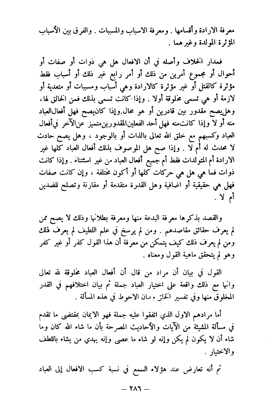 القَوْل فِي بَيَان أَن مُرَاد من قَالَ أَن أَفعَال الْعباد مخلوقة لله تَعَالَى وانها مَعَ ذَلِك وَاقعَة على اخْتِيَار الْعباد جملَة ثمَّ بَيَان اخْتلَافهمْ فِي الْقدر الْمَخْلُوق مِنْهَا وَفِي تَفْسِير الْخلق وَبَيَان الاحوط فِي هَذِه الْمَسْأَلَة
