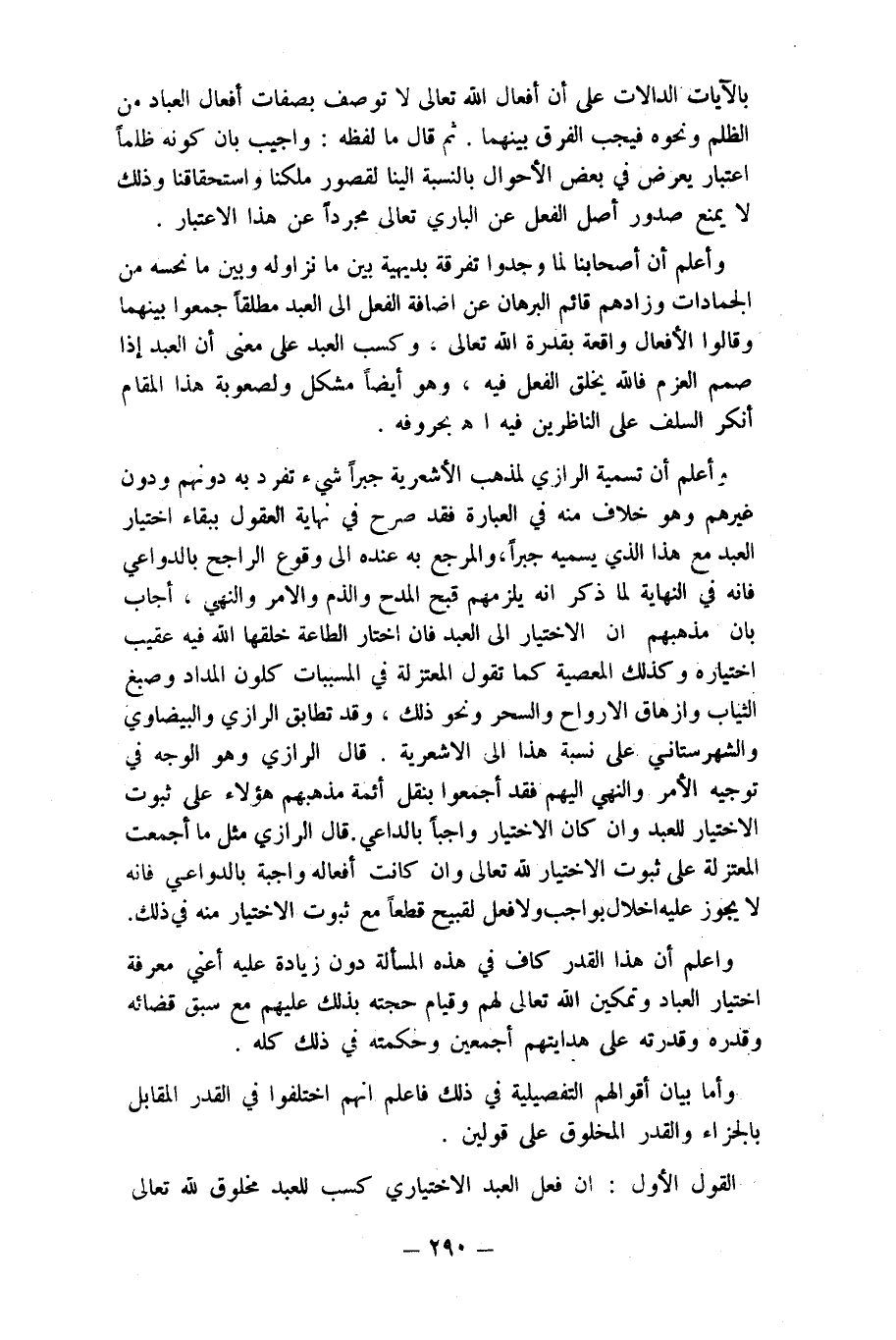 وَأعلم أَن تَسْمِيَة الرَّازِيّ لمَذْهَب الأشعرية جبرا شَيْء تفرد بِهِ دونهم وَدون غَيرهم وَهُوَ خلاف مِنْهُ فِي الْعبارَة فقد صرح فِي نِهَايَة الْعُقُول بِبَقَاء اخْتِيَار العَبْد مَعَ هَذَا الَّذِي يُسَمِّيه جبرا والمرجع بِهِ عِنْده إِلَى وُقُوع الرَّاجِح بالدواعي فانه فِي النِّهَايَة لما ذكر انه يلْزمهُم قبح الْمَدْح والذم والامر وَالنَّهْي أجَاب بَان مَذْهَبهم ان الِاخْتِيَار الى العَبْد فان اخْتَار الطَّاعَة خلقهَا الله فِيهِ عقيب اخْتِيَاره وَكَذَلِكَ الْمعْصِيَة كَمَا تَقول الْمُعْتَزلَة فِي المسببات كلون المداد وصبغ الثِّيَاب وازهاق الارواح وَالسحر وَنَحْو ذَلِك وَقد تطابق الرَّازِيّ والبيضاوي والشهرستاني على نِسْبَة هَذَا الى الاشعرية قَالَ الرَّازِيّ وَهُوَ الْوَجْه فِي تَوْجِيه الْأَمر وَالنَّهْي اليهم فقد أَجمعُوا بِنَقْل أَئِمَّة مَذْهَبهم هَؤُلَاءِ على ثُبُوت الِاخْتِيَار للْعَبد وان كَانَ الِاخْتِيَار وَاجِبا بالداعي قَالَ الرَّازِيّ مثل مَا أَجمعت الْمُعْتَزلَة على ثُبُوت الِاخْتِيَار لله تَعَالَى وان كَانَت أَفعاله وَاجِبَة بالدواعي فانه لَا يجوز عَلَيْهِ اخلال بِوَاجِب وَلَا فعل لقبيح قطعا مَعَ ثُبُوت الِاخْتِيَار مِنْهُ فِي ذَلِك