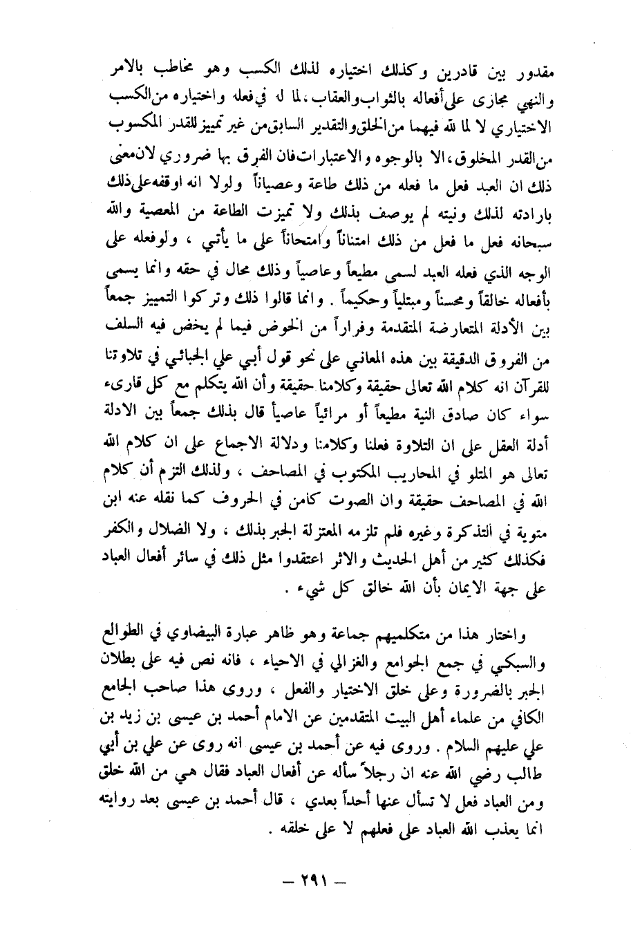 وَاخْتَارَ هَذَا من متكلميهم جمَاعَة وَهُوَ ظَاهر عبارَة الْبَيْضَاوِيّ فِي الطوالع والسبكي فِي جمع الْجَوَامِع وَالْغَزالِيّ فِي الاحياء فانه نَص فِيهِ على بطلَان الْجَبْر بِالضَّرُورَةِ وعَلى خلق الِاخْتِيَار وَالْفِعْل وروى هَذَا صَاحب الْجَامِع الْكَافِي من عُلَمَاء أهل الْبَيْت الْمُتَقَدِّمين عَن الامام أَحْمد بن عِيسَى بن زيد بن عَليّ عَلَيْهِم السَّلَام وروى فِيهِ عَن أَحْمد بن عِيسَى انه روى عَن عَليّ بن أبي طَالب رَضِي الله عَنهُ ان رجلا سَأَلَهُ عَن أَفعَال الْعباد فَقَالَ هِيَ من الله خلق وَمن الْعباد فعل لَا تسْأَل عَنْهَا أحدا بعدِي قَالَ أَحْمد بن عِيسَى بعد رِوَايَته انما يعذب الله الْعباد على فعلهم لَا على خلقه
