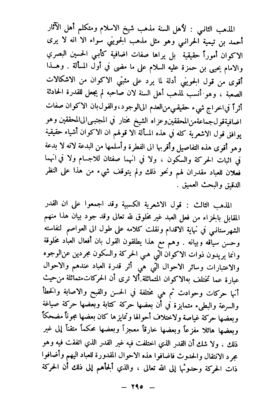 الْمَذْهَب الثَّانِي لأهل السّنة مَذْهَب شيخ الاسلام ومتكلم أهل الْآثَار أَحْمد بن تَيْمِية الْحَرَّانِي وَهُوَ مثل مَذْهَب الْجُوَيْنِيّ سَوَاء الا أَنه لَا يرى الاكوان أمورا حَقِيقِيَّة بل يَرَاهَا صِفَات اضافية كَأبي الْحُسَيْن الْبَصْرِيّ والامام يحيى بن حَمْزَة عَلَيْهِ السَّلَام على مَا مضى فِي أول الْمَسْأَلَة وَهَذَا أقوى من قَول الْجُوَيْنِيّ أَدِلَّة لما يرد على مثبتي الاكوان من الاشكالات الصعبة وَهُوَ أنسب لمَذْهَب أهل السّنة لَان صَاحبه لم يَجْعَل للقدرة الْحَادِثَة أثرا فِي اخراج شَيْء حَقِيقِيّ من الْعَدَم إِلَى الْوُجُود وَالْقَوْل بَان الاكوان صِفَات اضافية قَول جمَاعَة من الْمُحَقِّقين وَعَزاهُ الشَّيْخ مُخْتَار فِي الْمُجْتَبى الى الْمُحَقِّقين وَهُوَ يُوَافق قَول الاشعرية كُله فِي هَذِه الْمَسْأَلَة الا قَوْلهم ان الاكوان أَشْيَاء حَقِيقِيَّة وَهُوَ أقوى هَذِه التفاصيل وأقربها الى الْفطْرَة وأسلمها من الْبِدْعَة لانه لَا بِدعَة فِي اثبات الْحَرَكَة والسكون وَلَا فِي انهما صفتان للاجسام وَلَا فِي انهما فعلان للعباد مقدران لَهُم وَنَحْو ذَلِك وَلم يتَوَقَّف شئ من هَذَا على النّظر الدَّقِيق والبحث العميق