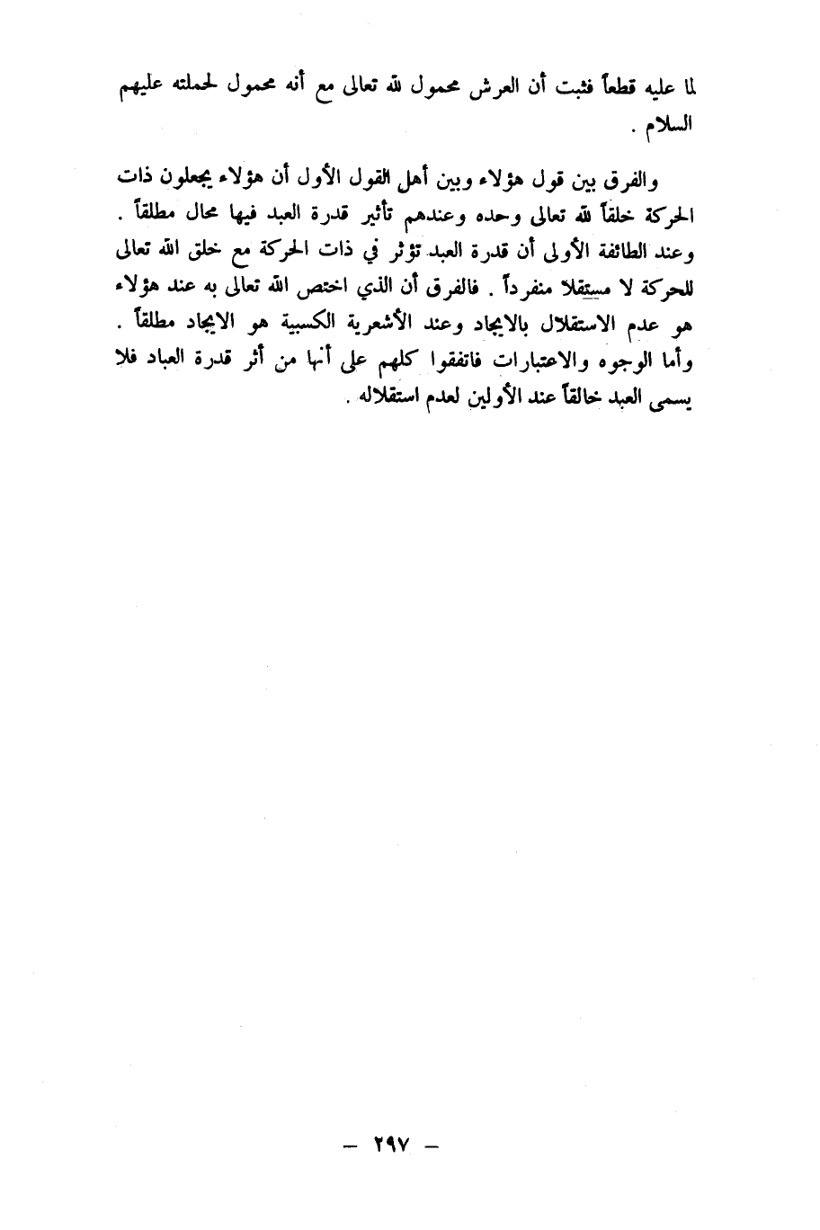 وَالْفرق بَين قَول هَؤُلَاءِ وَبَين أهل القَوْل الأول أَن هَؤُلَاءِ يجْعَلُونَ ذَات الْحَرَكَة خلقا لله تَعَالَى وَحده وَعِنْدهم تَأْثِير قدرَة العَبْد فِيهَا محَال مُطلقًا وَعند الطَّائِفَة الأولى أَن قدرَة العَبْد تُؤثر فِي ذَات الْحَرَكَة مَعَ خلق الله تَعَالَى للحركة لَا مُسْتقِلّا مُنْفَردا فَالْفرق أَن الَّذِي اخْتصَّ الله تَعَالَى بِهِ عِنْد هَؤُلَاءِ هُوَ عدم الِاسْتِقْلَال بالايجاد وَعند الأشعرية الكسبية هُوَ الايجاد مُطلقًا وَأما الْوُجُوه والاعتبارات فاتفقوا كلهم على أَنَّهَا من أثر قدرَة الْعباد فَلَا يُسمى العَبْد خَالِقًا عِنْد الْأَوَّلين لعدم استقلاله