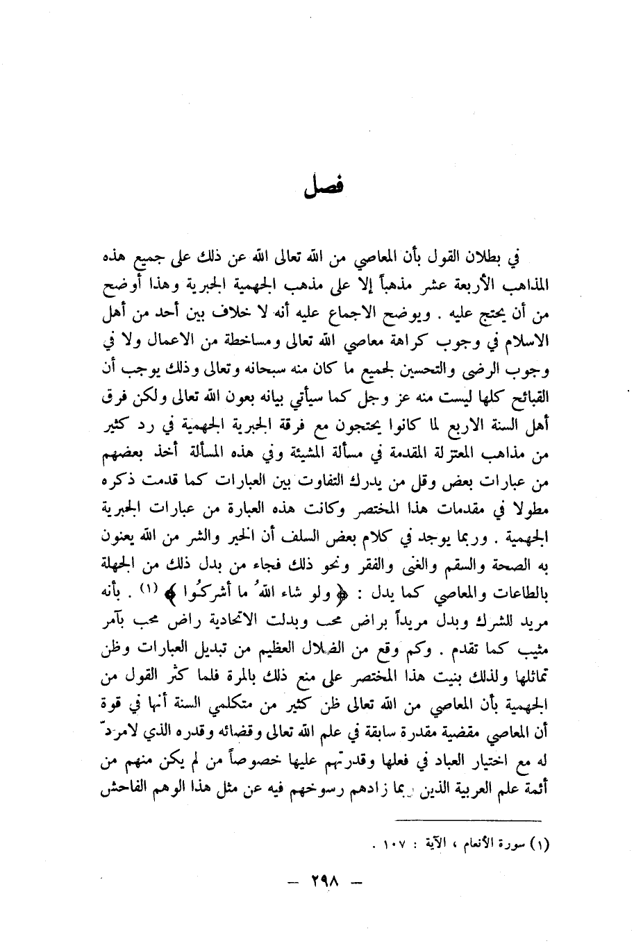 فِي بطلَان القَوْل بِأَن الْمعاصِي من الله تَعَالَى الله عَن ذَلِك على جَمِيع هَذِه الْمذَاهب الْأَرْبَعَة عشر مذهبا إِلَّا على مَذْهَب الْجَهْمِية الجبرية وَهَذَا أوضح من أَن يحْتَج عَلَيْهِ ويوضح الاجماع عَلَيْهِ أَنه لَا خلاف بَين أحد من أهل الاسلام فِي وجوب كَرَاهَة معاصي الله تَعَالَى ومساخطة من الاعمال وَلَا فِي وجوب الرضى والتحسين لجَمِيع مَا كَانَ مِنْهُ سُبْحَانَهُ وَتَعَالَى وَذَلِكَ يُوجب أَن القبائح كلهَا لَيست مِنْهُ عز وَجل كَمَا سَيَأْتِي بَيَانه بعون الله تَعَالَى وَلَكِن فرق أهل السّنة الاربع لما كَانُوا يحتجون مَعَ فرقة الجبرية الْجَهْمِية فِي رد كثير من مَذَاهِب الْمُعْتَزلَة الْمُقدمَة فِي مَسْأَلَة الْمَشِيئَة وَفِي هَذِه الْمَسْأَلَة أَخذ بَعضهم من عِبَارَات بعض وَقل من يدْرك التَّفَاوُت بَين الْعبارَات كَمَا قدمت ذكره مطولا فِي مُقَدمَات هَذَا الْمُخْتَصر وَكَانَت هَذِه الْعبارَة من عِبَارَات الجبرية الْجَهْمِية وَرُبمَا يُوجد فِي كَلَام بعض السّلف أَن الْخَيْر وَالشَّر من الله يعنون بِهِ الصِّحَّة والسقم والغنى والفقر وَنَحْو ذَلِك فجَاء من بدل ذَلِك من الجهلة بالطاعات والمعاصي كَمَا يدل {وَلَو شَاءَ الله مَا أشركوا} بِأَنَّهُ مُرِيد للشرك وَبدل مرِيدا براض محب وبدلت الاتحادية رَاض محب بآمر مثيب كَمَا تقدم وَكم وَقع من الضلال الْعَظِيم من تَبْدِيل الْعبارَات وَظن تماثلها وَلذَلِك بنيت هَذَا الْمُخْتَصر على منع ذَلِك بالمرة فَلَمَّا كثر القَوْل من الْجَهْمِية بِأَن الْمعاصِي من الله تَعَالَى ظن كثير من متكلمي السّنة أَنَّهَا فِي قُوَّة أَن الْمعاصِي مقضية مقدرَة سَابِقَة فِي علم الله تَعَالَى وقضائه وَقدره الَّذِي لَا مرد لَهُ مَعَ اخْتِيَار الْعباد فِي فعلهَا وقدرتهم عَلَيْهَا خُصُوصا من لم يكن مِنْهُم من أَئِمَّة علم الْعَرَبيَّة الَّذين رُبمَا زادهم رسوخهم فِيهِ عَن مثل هَذَا الْوَهم الْفَاحِش