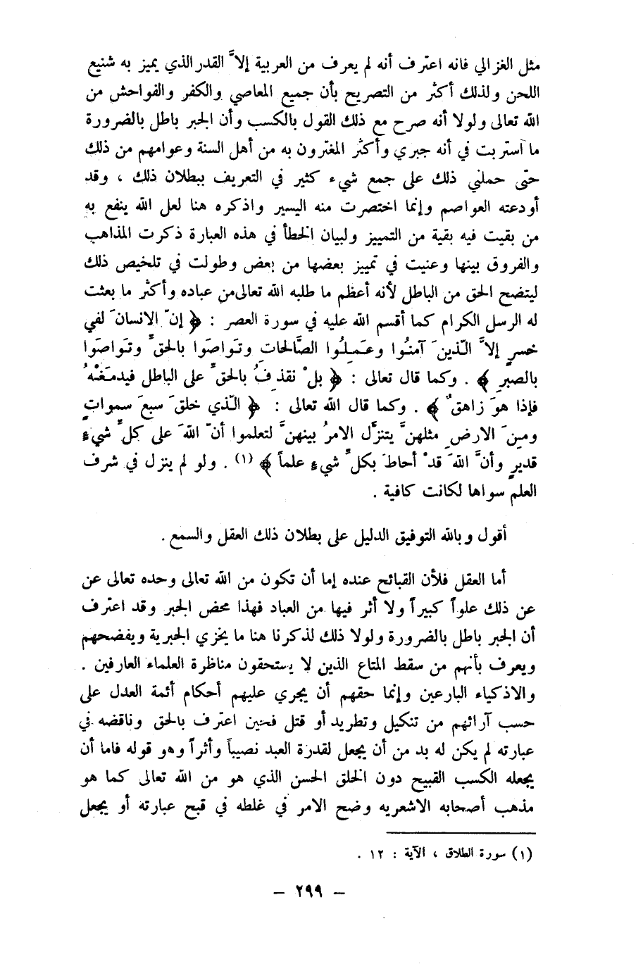 مثل الْغَزالِيّ فانه اعْترف أَنه لم يعرف من الْعَرَبيَّة إِلَّا الْقدر الَّذِي يُمَيّز بِهِ شنيع اللّحن وَلذَلِك أَكثر من التَّصْرِيح بِأَن جَمِيع الْمعاصِي وَالْكفْر وَالْفَوَاحِش من الله تَعَالَى وَلَوْلَا أَنه صرح مَعَ ذَلِك القَوْل بِالْكَسْبِ وَأَن الْجَبْر بَاطِل بِالضَّرُورَةِ مَا استربت فِي أَنه جبري وَأكْثر المغترون بِهِ من أهل السّنة وعوامهم من ذَلِك حَتَّى حَملَنِي ذَلِك على جمع شَيْء كثير فِي التَّعْرِيف بِبُطْلَان ذَلِك وَقد أودعته العواصم وَإِنَّمَا اختصرت مِنْهُ الْيَسِير واذكره هُنَا لَعَلَّ الله ينفع بِهِ من بقيت فِيهِ بَقِيَّة من التَّمْيِيز ولبيان الْخَطَأ فِي هَذِه الْعبارَة ذكرت الْمذَاهب والفروق بَينهَا وعنيت فِي تَمْيِيز بَعْضهَا من بعض وطولت فِي تَلْخِيص ذَلِك ليتضح الْحق من الْبَاطِل لِأَنَّهُ أعظم مَا طلبه الله تَعَالَى من عباده وَأكْثر مَا بعثت لَهُ الرُّسُل الْكِرَام كَمَا أقسم الله عَلَيْهِ فِي سُورَة الْعَصْر {إِن الْإِنْسَان لفي خسر إِلَّا الَّذين آمنُوا وَعمِلُوا الصَّالِحَات وَتَوَاصَوْا بِالْحَقِّ وَتَوَاصَوْا بِالصبرِ} وكما قَالَ تَعَالَى {بل نقذف بِالْحَقِّ على الْبَاطِل فيدمغه فَإِذا هُوَ زاهق} وكما قَالَ الله تَعَالَى {الَّذِي خلق سبع سماوات وَمن الأَرْض مِثْلهنَّ يتنزل الْأَمر بَينهُنَّ لِتَعْلَمُوا أَن الله على كل شَيْء قدير وَأَن الله قد أحَاط بِكُل شَيْء علما} وَلَو لم ينزل فِي شرف الْعلم سواهَا لكَانَتْ كَافِيَة