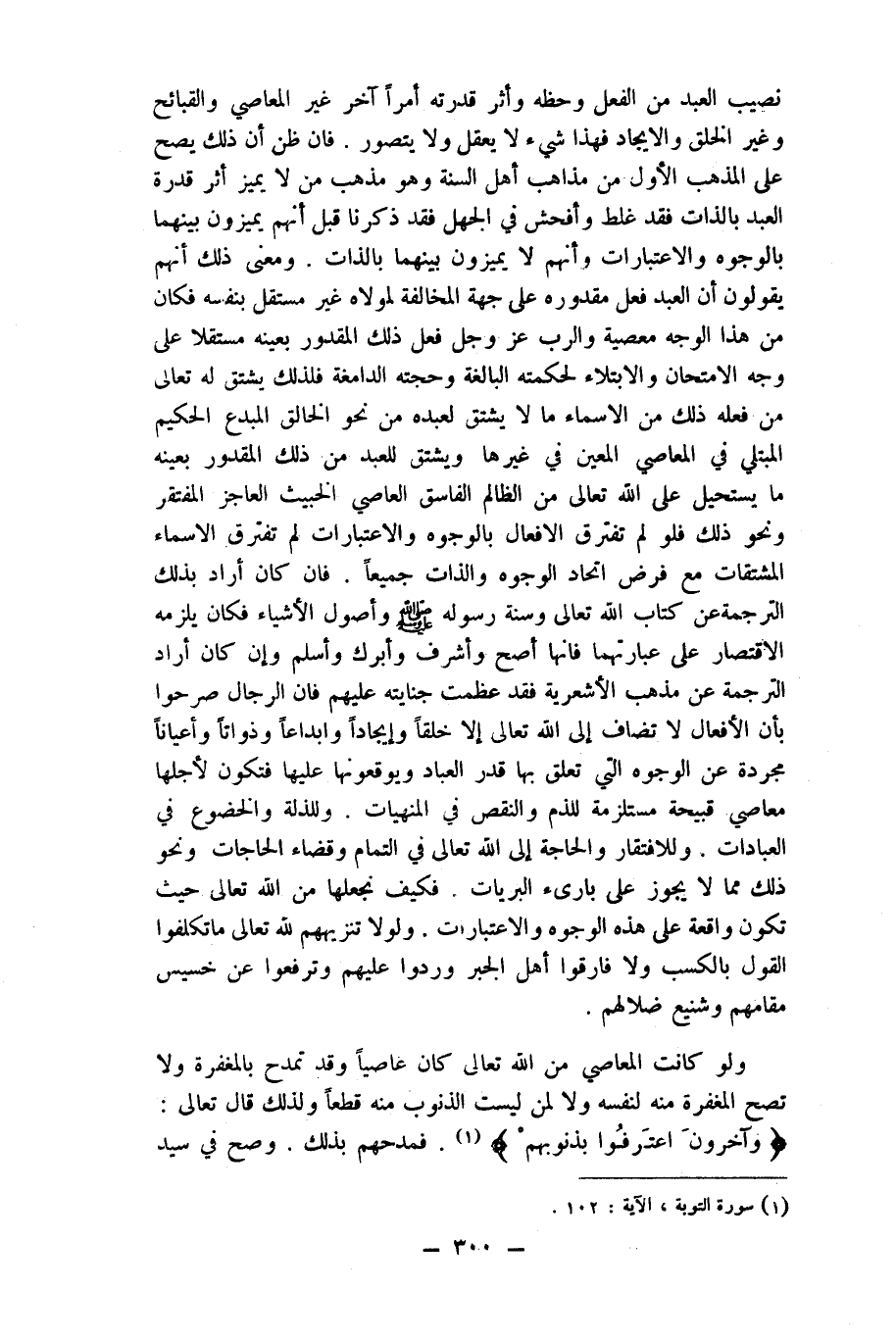 نصيب العَبْد من الْفِعْل وحظه وَأثر قدرته أمرا آخر غير الْمعاصِي والقبائح وَغير الْخلق والايجاد فَهَذَا شَيْء لَا يعقل وَلَا يتَصَوَّر فان ظن أَن ذَلِك يَصح على الْمَذْهَب الأول من مَذَاهِب أهل السّنة وَهُوَ مَذْهَب من لَا يُمَيّز أثر قدرَة العَبْد بِالذَّاتِ فقد غلط وأفحش فِي الْجَهْل فقد ذكرنَا قبل أَنهم يميزون بَينهمَا بالوجوه والاعتبارات وَأَنَّهُمْ لَا يميزون بَينهمَا بِالذَّاتِ وَمعنى ذَلِك أَنهم يَقُولُونَ أَن العَبْد فعل مقدوره على جِهَة الْمُخَالفَة لمَوْلَاهُ غير مُسْتَقل بِنَفسِهِ فَكَانَ من هَذَا الْوَجْه مَعْصِيّة والرب عز وَجل فعل ذَلِك الْمَقْدُور بِعَيْنِه مُسْتقِلّا على وَجه الامتحان والابتلاء لحكمته الْبَالِغَة وحجته الدامغة فَلذَلِك يشتق لَهُ تَعَالَى من فعله ذَلِك من الاسماء مَا لَا يشتق لعَبْدِهِ من نَحْو الْخَالِق الْمُبْدع الْحَكِيم المبتلي فِي الْمعاصِي الْمعِين فِي غَيرهَا ويشتق للْعَبد من ذَلِك الْمَقْدُور بِعَيْنِه مَا يَسْتَحِيل على الله تَعَالَى من الظَّالِم الْفَاسِق العَاصِي الْخَبيث الْعَاجِز المفتقر وَنَحْو ذَلِك فَلَو لم تفترق الافعال بالوجوه والاعتبارات لم تفترق الاسماء المشتقات مَعَ فرض اتِّحَاد الْوُجُوه والذات جَمِيعًا فان كَانَ أَرَادَ بذلك التَّرْجَمَة عَن كتاب الله تَعَالَى وَسنة رَسُوله صلى الله عَلَيْهِ وَسلم وأصول الْأَشْيَاء فَكَانَ يلْزمه الِاقْتِصَار على عبارتهما فانها أصح وأشرف وأبرك وَأسلم وَإِن كَانَ أَرَادَ التَّرْجَمَة عَن مَذْهَب الأشعرية فقد عظمت جِنَايَته عَلَيْهِم فان الرِّجَال صَرَّحُوا بِأَن الْأَفْعَال لَا تُضَاف إِلَى الله تَعَالَى إِلَّا خلقا وإيجادا وابداعا وذواتا وأعيانا مُجَرّدَة عَن الْوُجُوه الَّتِي تعلق بهَا قدر الْعباد ويوقعونها عَلَيْهَا فَتكون لأَجلهَا معاصي قبيحة مستلزمة للذم وَالنَّقْص فِي المنهيات وللذلة والخضوع فِي الْعِبَادَات وللافتقار وَالْحَاجة إِلَى الله تَعَالَى فِي التَّمام وَقَضَاء الْحَاجَات وَنَحْو ذَلِك مِمَّا لَا يجوز على بارئ البريات فَكيف نَجْعَلهَا من الله تَعَالَى حَيْثُ تكون وَاقعَة على هَذِه الْوُجُوه والاعتبارات وَلَوْلَا تنزيههم لله تَعَالَى مَا تكلفوا القَوْل بِالْكَسْبِ وَلَا فارقوا أهل الْجَبْر وردوا عَلَيْهِم وترفعوا عَن خسيس مقامهم وشنيع ضلالهم
