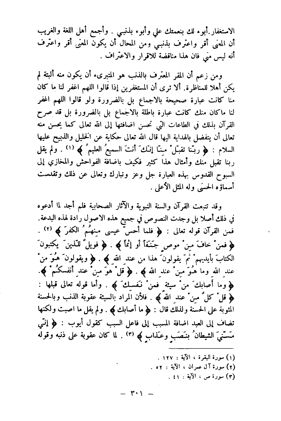 وَقد تتبعت الْقُرْآن وَالسّنة النَّبَوِيَّة والْآثَار الصحابية فَلم أجد لما أَدْعُوهُ فِي ذَلِك أصلا بل وجدت النُّصُوص فِي جَمِيع هَذِه الاصول رادة لهَذِهِ الْبِدْعَة فَمن الْقُرْآن قَوْله تَعَالَى {فَلَمَّا أحس عِيسَى مِنْهُم الْكفْر} {فَمن خَافَ من موص جنفا أَو إِثْمًا} {فويل للَّذين يَكْتُبُونَ الْكتاب بِأَيْدِيهِم ثمَّ يَقُولُونَ هَذَا من عِنْد الله} {وَيَقُولُونَ هُوَ من عِنْد الله وَمَا هُوَ من عِنْد الله} {قل هُوَ من عِنْد أَنفسكُم} {وَمَا أَصَابَك من سَيِّئَة فَمن نَفسك} وَأما قَوْله تَعَالَى قبلهَا {قل كل من عِنْد الله} فَلِأَن المُرَاد بِالسَّيِّئَةِ عُقُوبَة الذَّنب وبالحسنة المثوبة على الْحَسَنَة وَلذَلِك قَالَ {مَا أَصَابَك} وَلم يقل مَا اصبت وَلكنهَا تُضَاف إِلَى العَبْد اضافة الْمُسَبّب إِلَى فَاعل السَّبَب كَقَوْل أَيُّوب {أَنِّي مسني الشَّيْطَان بِنصب وَعَذَاب} لما كَانَ عُقُوبَة على ذَنبه وَقَوله