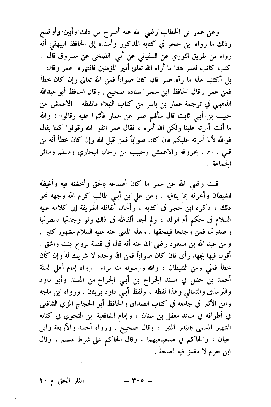قلت رَضِي الله عَن عمر مَا كَانَ أصدعه بِالْحَقِّ وأخشنه فِيهِ وأغيظه للشَّيْطَان وأعرفه بِمَا يُنَافِيهِ وَعَن عَليّ بن أبي طَالب كرم الله وَجهه نَحْو ذَلِك ذكره ابْن حجر فِي كِتَابه وأحال أَلْفَاظه الشَّرِيفَة إِلَى كَلَامه عَلَيْهِ السَّلَام فِي حكم أم الْوَلَد وَلم أجد أَلْفَاظه فِي ذَلِك وَلَو وَجدتهَا لسطرتها وصدرتها فَمن وجدهَا فيلحقها وَهَذَا الْمَعْنى عَنهُ عَلَيْهِ السَّلَام مَشْهُور كثيرا وَعَن عبد الله بن مَسْعُود رَضِي الله عَنهُ أَنه قَالَ فِي قصَّة بروع بنت واشق أَقُول فِيهَا بِجهْد رَأْي فان كَانَ صَوَابا فَمن الله وَحده لَا شريك لَهُ وَإِن كَانَ خطأ فمني وَمن الشَّيْطَان وَالله وَرَسُوله مِنْهُ برَاء رَوَاهُ إِمَام أهل السّنة أَحْمد بن حَنْبَل فِي مُسْند الْجراح بن أبي الْجراح من الْمسند وَأَبُو دَاوُد وَالتِّرْمِذِيّ وَالنَّسَائِيّ وَهَذَا لَفظه وَلَفظ أبي دَاوُد بريئان وَرَوَاهُ ابْن مَاجَه وَابْن الْأَثِير فِي جَامعه فِي كتاب الصَدَاق والحافظ أَبُو الْحجَّاج الْمزي الشَّافِعِي فِي أَطْرَافه فِي مُسْند معقل بن سِنَان وَإِمَام الشَّافِعِيَّة ابْن النَّحْوِيّ فِي كِتَابه الشهير الْمُسَمّى بالبدر الْمُنِير وَقَالَ صَحِيح وَرَوَاهُ أَحْمد وَالْأَرْبَعَة وَابْن حبَان وَالْحَاكِم فِي صَحِيحَيْهِمَا وَقَالَ الْحَاكِم على شَرط مُسلم وَقَالَ ابْن حزم لَا مغمز فِيهِ لصِحَّة