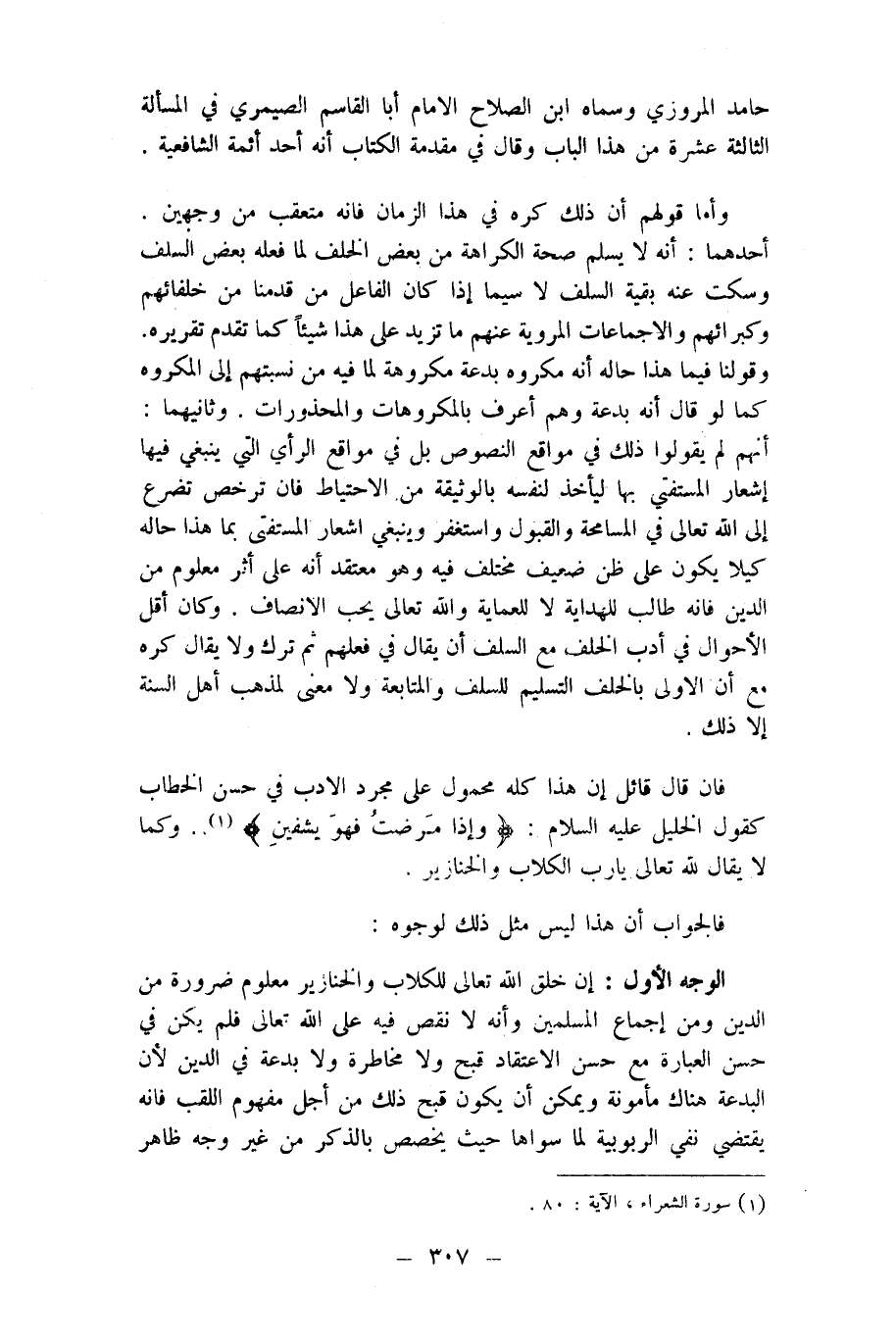 وَأما قَوْلهم أَن ذَلِك كره فِي هَذَا الزَّمَان فانه متعقب من وَجْهَيْن أَحدهمَا أَنه لَا يسلم صِحَة الْكَرَاهَة من بعض الْخلف لما فعله بعض السّلف وَسكت عَنهُ بَقِيَّة السّلف لَا سِيمَا إِذا كَانَ الْفَاعِل من قدمنَا من خلفائهم وكبرائهم والاجماعات المروية عَنْهُم مَا تزيد على هَذَا شَيْئا كَمَا تقدم تَقْرِيره وَقَوْلنَا فِيمَا هَذَا حَاله أَنه مَكْرُوه بِدعَة مَكْرُوهَة لما فِيهِ من نسبتهم إِلَى الْمَكْرُوه كَمَا لَو قَالَ أَنه بِدعَة وهم أعرف بالمكروهات والمحذورات وَثَانِيهمَا أَنهم لم يَقُولُوا ذَلِك فِي مواقع النُّصُوص بل فِي مواقع الرَّأْي الَّتِي يَنْبَغِي فِيهَا إِشْعَار المستفتي بهَا ليَأْخُذ لنَفسِهِ بالوثيقة من الِاحْتِيَاط فان ترخص تضرع إِلَى الله تَعَالَى فِي الْمُسَامحَة وَالْقَبُول واستغفر وَيَنْبَغِي اشعار المستفتى بِمَا هَذَا حَاله كَيْلا يكون على ظن ضَعِيف مُخْتَلف فِيهِ وَهُوَ مُعْتَقد أَنه على أثر مَعْلُوم من الدّين فانه طَالب للهداية لَا للعماية وَالله تَعَالَى يحب الانصاف وَكَانَ أقل الْأَحْوَال فِي أدب الْخلف مَعَ السّلف أَن يُقَال فِي فعلهم ثمَّ ترك وَلَا يُقَال كره مَعَ أَن الاولى بالخلف التَّسْلِيم للسلف والمتابعة وَلَا معنى لمَذْهَب أهل السّنة إِلَّا ذَلِك