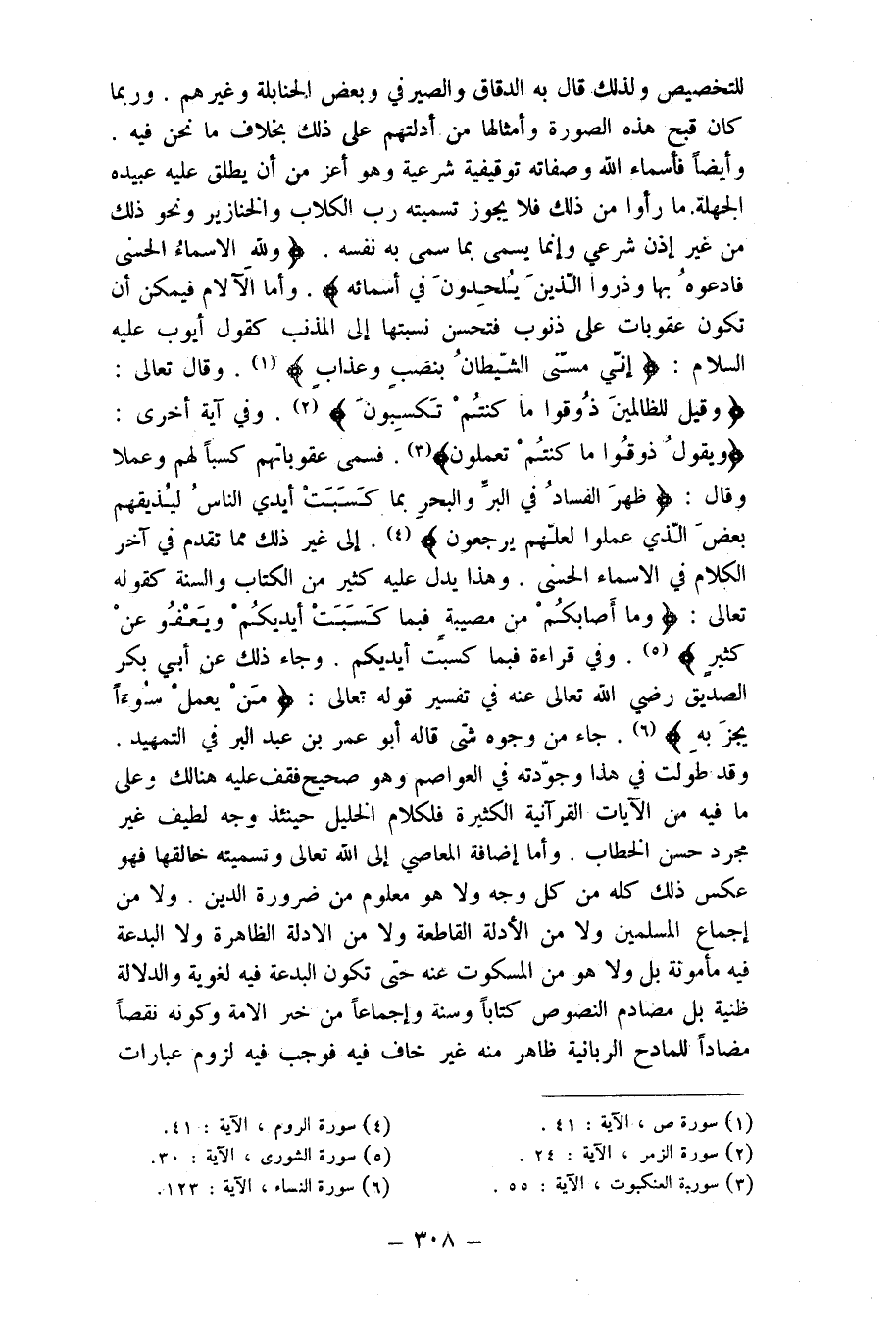 للتخصيص وَلذَلِك قَالَ بِهِ الدقاق والصيرفي وَبَعض الْحَنَابِلَة وَغَيرهم وَرُبمَا كَانَ قبح هَذِه الصُّورَة وأمثالها من أدلتهم على ذَلِك بِخِلَاف مَا نَحن فِيهِ وَأَيْضًا فأسماء الله وَصِفَاته توقيفية شَرْعِيَّة وَهُوَ أعز من أَن يُطلق عَلَيْهِ عبيده الجهلة مَا رَأَوْا من ذَلِك فَلَا يجوز تَسْمِيَته رب الْكلاب والخنازير وَنَحْو ذَلِك من غير إِذن شَرْعِي وَإِنَّمَا يُسمى بِمَا سمى بِهِ نَفسه {وَللَّه الْأَسْمَاء الْحسنى فَادعوهُ بهَا وذروا الَّذين يلحدون فِي أَسْمَائِهِ} وَأما الآلام فَيمكن أَن تكون عقوبات على ذنُوب فتحسن نسبتها إِلَى المذنب كَقَوْل أَيُّوب عَلَيْهِ السَّلَام {أَنِّي مسني الشَّيْطَان بِنصب وَعَذَاب} وَقَالَ تَعَالَى {وَقيل للظالمين ذوقوا مَا كُنْتُم تكسبون} وَفِي آيَة أُخْرَى {وَيَقُول ذوقوا مَا كُنْتُم تَعْمَلُونَ} فَسمى عقوباتهم كسبا لَهُم وَعَملا وَقَالَ {ظهر الْفساد فِي الْبر وَالْبَحْر بِمَا كسبت أَيدي النَّاس ليذيقهم بعض الَّذِي عمِلُوا لَعَلَّهُم يرجعُونَ} إِلَى غير ذَلِك مِمَّا تقدم فِي آخر الْكَلَام فِي الاسماء الْحسنى وَهَذَا يدل عَلَيْهِ كثير من الْكتاب وَالسّنة كَقَوْلِه تَعَالَى {وَمَا أَصَابَكُم من مُصِيبَة فبمَا كسبت أَيْدِيكُم وَيَعْفُو عَن كثير} وَفِي قِرَاءَة فبمَا كسبت أَيْدِيكُم وَجَاء ذَلِك عَن أبي بكر الصّديق رَضِي الله تَعَالَى عَنهُ فِي تَفْسِير قَوْله تَعَالَى {من يعْمل سوءا يجز بِهِ} جَاءَ من وُجُوه شَتَّى قَالَه أَبُو عمر بن عبد الْبر فِي التَّمْهِيد وَقد طولت فِي هَذَا وجودته فِي العواصم وَهُوَ صَحِيح فقف عَلَيْهِ هُنَالك وعَلى مَا فِيهِ من الْآيَات القرآنية الْكَثِيرَة فلكلام الْخَلِيل حِينَئِذٍ وَجه لطيف غير مُجَرّد حسن الْخطاب وَأما إِضَافَة الْمعاصِي إِلَى الله تَعَالَى وتسميته خَالِقهَا فَهُوَ عكس ذَلِك كُله من كل وَجه وَلَا هُوَ مَعْلُوم من ضَرُورَة الدّين وَلَا من إِجْمَاع الْمُسلمين وَلَا من الْأَدِلَّة القاطعة وَلَا من الْأَدِلَّة الظَّاهِرَة وَلَا الْبِدْعَة فِيهِ مَأْمُونَة بل وَلَا هُوَ من الْمَسْكُوت عَنهُ حَتَّى تكون الْبِدْعَة فِيهِ لغوية وَالدّلَالَة ظنية بل مصادم النُّصُوص كتابا وَسنة وإجماعا من خير الامة وَكَونه نقصا مضادا للمادح الربانية ظَاهر مِنْهُ غير خَافَ فِيهِ فَوَجَبَ فِيهِ لُزُوم عِبَارَات