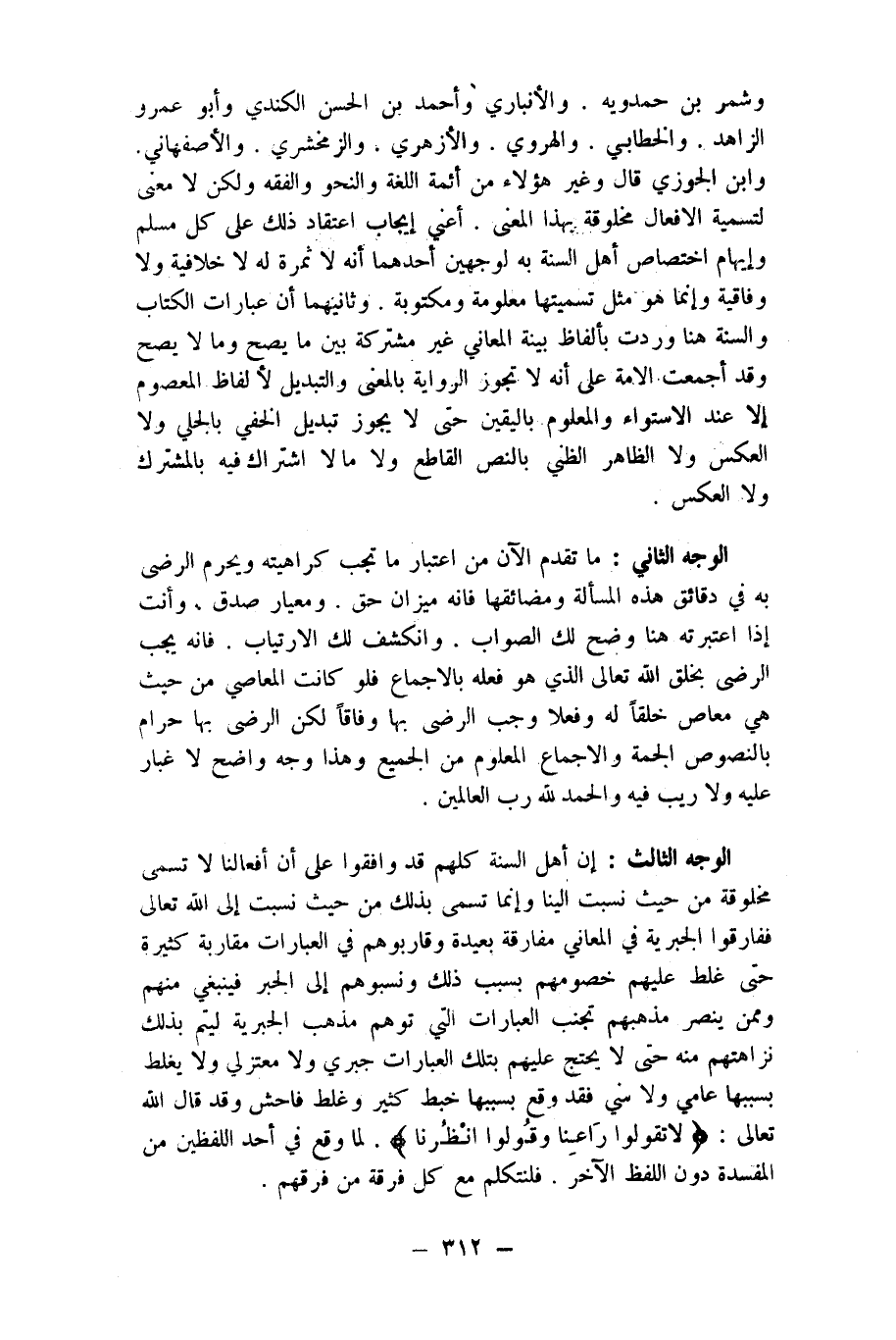الْوَجْه الثَّالِث إِن أهل السّنة كلهم قد وافقوا على أَن أفعالنا لَا تسمى مخلوقة من حَيْثُ نسبت الينا وَإِنَّمَا تسمى بذلك من حَيْثُ نسبت إِلَى الله تَعَالَى ففارقوا الجبرية فِي الْمعَانِي مُفَارقَة بعيدَة وقاربوهم فِي الْعبارَات مقاربة كَثِيرَة حَتَّى غلط عَلَيْهِم خصومهم بِسَبَب ذَلِك ونسبوهم إِلَى الْجَبْر فَيَنْبَغِي مِنْهُم وَمِمَّنْ ينصر مَذْهَبهم تجنب الْعبارَات الَّتِي توهم مَذْهَب الجبرية ليتم بذلك نزاهتهم مِنْهُ حَتَّى لَا يحْتَج عَلَيْهِم بِتِلْكَ الْعبارَات جبري وَلَا معتزلي وَلَا يغلط بِسَبَبِهَا عَامي وَلَا سني فقد وَقع بِسَبَبِهَا خبط كثير وَغلط فَاحش وَقد قَالَ الله تَعَالَى {لَا تَقولُوا رَاعنا وَقُولُوا انظرنا} لما وَقع فِي أحد اللَّفْظَيْنِ من الْمفْسدَة دون اللَّفْظ الآخر فلنتكلم مَعَ كل فرقة من فرقهم