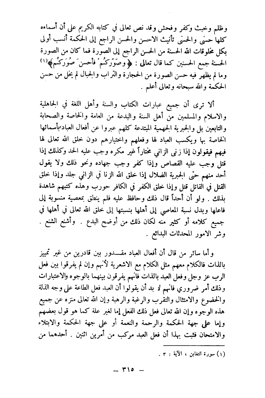 وظلم وخبث وَكفر وفحش وَقد نَص تَعَالَى فِي كِتَابه الْكَرِيم على أَن أسماءه كلهَا حسنى وَالْحُسْنَى تَأْنِيث الاحسن وَالْحسن الرَّاجِع إِلَى الْحِكْمَة أنسب أولى بِكُل مخلوقات الله الْحَسَنَة من الْحسن الرَّاجِع إِلَى الصُّورَة فَمَا كَانَ من الصُّورَة الْحَسَنَة جمع الحسنين كَمَا قَالَ تَعَالَى {وصوركم فَأحْسن صوركُمْ} وَمَا لم يظْهر فِيهِ حسن الصُّورَة من الْحِجَارَة وَالتُّرَاب وَالْجِبَال لم يخل من حسن الْحِكْمَة وَالله سُبْحَانَهُ وَتَعَالَى أعلم