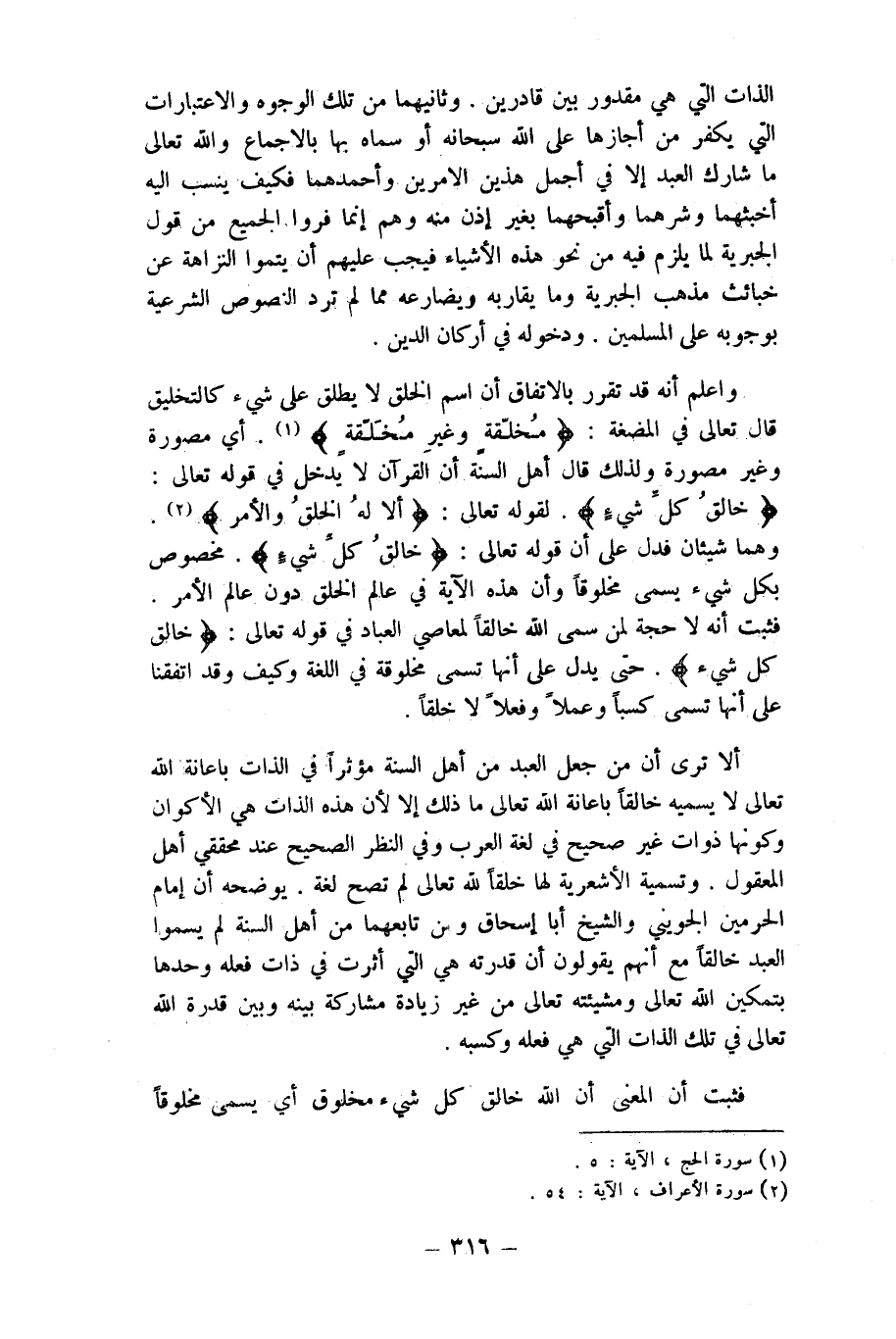 الذَّات الَّتِي هِيَ مَقْدُور بَين قَادِرين وَثَانِيهمَا من تِلْكَ الْوُجُوه والاعتبارات الَّتِي يكفر من أجازها على الله سُبْحَانَهُ أَو سَمَّاهُ بهَا بالاجماع وَالله تَعَالَى مَا شَارك العَبْد إِلَّا فِي أجمل هذَيْن الامرين وأحمدهما فَكيف ينْسب اليه أخبثهما وشرهما وأقبحهما بِغَيْر إِذن مِنْهُ وهم إِنَّمَا فروا الْجَمِيع من قَول الجبرية لما يلْزم فِيهِ من نَحْو هَذِه الْأَشْيَاء فَيجب عَلَيْهِم أَن يتموا النزاهة عَن خبائث مَذْهَب الجبرية وَمَا يُقَارِبه ويضارعه مِمَّا لم ترد النُّصُوص الشَّرْعِيَّة بِوُجُوبِهِ على الْمُسلمين ودخوله فِي أَرْكَان الدّين