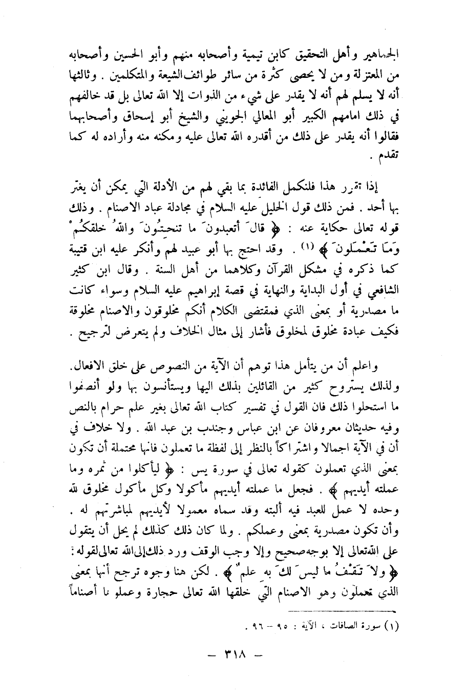 إِذا تقرر هَذَا فلنكمل الْفَائِدَة بِمَا بَقِي لَهُم من الْأَدِلَّة الَّتِي يُمكن أَن يغتر بهَا أحد فَمن ذَلِك قَول الْخَلِيل عَلَيْهِ السَّلَام فِي مجادلة عباد الاصنام وَذَلِكَ قَوْله تَعَالَى حِكَايَة عَنهُ {قَالَ أتعبدون مَا تنحتون وَالله خَلقكُم وَمَا تَعْمَلُونَ} وَقد احْتج بهَا أَبُو عبيد لَهُم وَأنكر عَلَيْهِ ابْن قُتَيْبَة كَمَا ذكره فِي مُشكل الْقُرْآن وَكِلَاهُمَا من أهل السّنة وَقَالَ ابْن كثير الشَّافِعِي فِي أول الْبِدَايَة وَالنِّهَايَة فِي قصَّة إِبْرَاهِيم عَلَيْهِ السَّلَام وَسَوَاء كَانَت مَا مَصْدَرِيَّة أَو بِمَعْنى الَّذِي فَمُقْتَضى الْكَلَام أَنكُمْ مخلوقون والاصنام مخلوقة فَكيف عبَادَة مَخْلُوق لمخلوق فَأَشَارَ إِلَى مِثَال الْخلاف وَلم يتَعَرَّض لترجيح