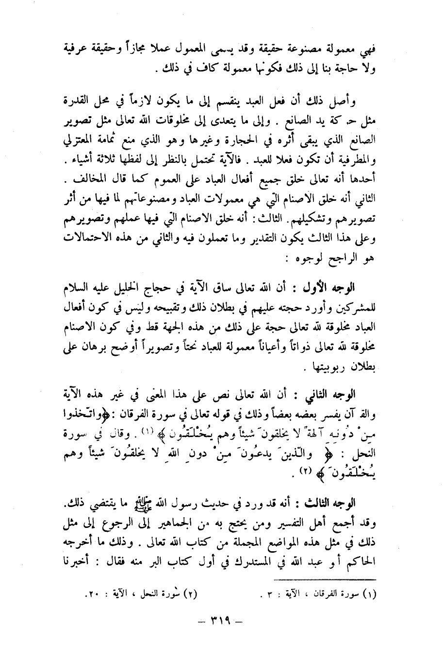 وأصل ذَلِك أَن فعل العَبْد يَنْقَسِم إِلَى مَا يكون لَازِما فِي مَحل الْقُدْرَة مثل حَرَكَة يَد الصَّانِع وَإِلَى مَا يتَعَدَّى إِلَى مخلوقات الله تَعَالَى مثل تَصْوِير الصَّانِع الَّذِي يبْقى أَثَره فِي الْحِجَارَة وَغَيرهَا وَهُوَ الَّذِي منع ثُمَامَة المعتزلي والمطرفية أَن تكون فعلا للْعَبد فالآية تحْتَمل بِالنّظرِ إِلَى لَفظهَا ثَلَاثَة أَشْيَاء أَحدهَا أَنه تَعَالَى خلق جَمِيع أَفعَال الْعباد على الْعُمُوم كَمَا قَالَ الْمُخَالف الثَّانِي أَنه خلق الاصنام الَّتِي هِيَ معمولات الْعباد ومصنوعاتهم لما فِيهَا من أثر تصويرهم وتشكيلهم