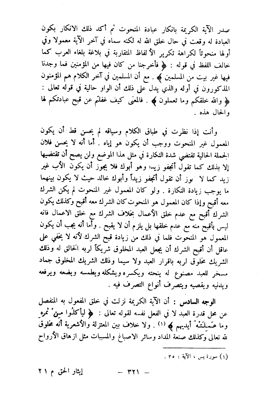 وَأَنت إِذا نظرت فِي طباق الْكَلَام وسياقه لم يحسن قطّ أَن يكون الْمَعْمُول غير المنحوت وَوَجَب أَن يكون هُوَ إِيَّاه أما أَنه لَا يحسن فلَان الْجُمْلَة الحالية تَقْتَضِي شدَّة النكارة فِي مثل هَذَا الْموضع وَلنْ يَصح أَن تقتضيها إِلَّا بذلك كَمَا تَقول أتجفو زيدا وَهُوَ أَبوك فَلَا يجوز أَن يكون الْأَب غير زيد كَمَا لَا يجوز أَن تَقول أتجفو زيدا وَأَبُوك خَالِد حَيْثُ لَا يكون بَينهمَا مَا يُوجب زِيَادَة النكارة وَلَو كَانَ الْمَعْمُول غير المنحوت لم يكن الشّرك مَعَه أقبح إِذا كَانَ الْمَعْمُول هُوَ المنحوت كَانَ الشّرك مَعَه أقبح وَكَذَلِكَ يكون الشّرك أقبح مَعَ عدم خلق الْأَعْمَال بِخِلَاف الشّرك مَعَ خلق الاعمال فانه لَيْسَ بأقبح مِنْهُ مَعَ عدم خلقهَا بل يلْزم أَن لَا يقبح وَأما أَنه يجب أَن يكون الْمَعْمُول هُوَ المنحوت فَلَمَّا فِي ذَلِك من زِيَادَة قبح الشّرك لِأَنَّهُ لَا يخفي على عَاقل أَن أقبح الشّرك أَن يَجْعَل العَبْد الْمَخْلُوق شَرِيكا لرَبه الْخَالِق لَهُ وَذَلِكَ الشَّرِيك مَخْلُوق لرَبه باقرار العَبْد وَلَا سِيمَا وَذَلِكَ الشَّرِيك الْمَخْلُوق جماد مسخر للْعَبد مَصْنُوع لَهُ ينحته ويكسره ويشكله ويطمسه ويضعه وَيَرْفَعهُ ويدنيه ويقصيه ويتصرف أَنْوَاع التَّصَرُّف فِيهِ