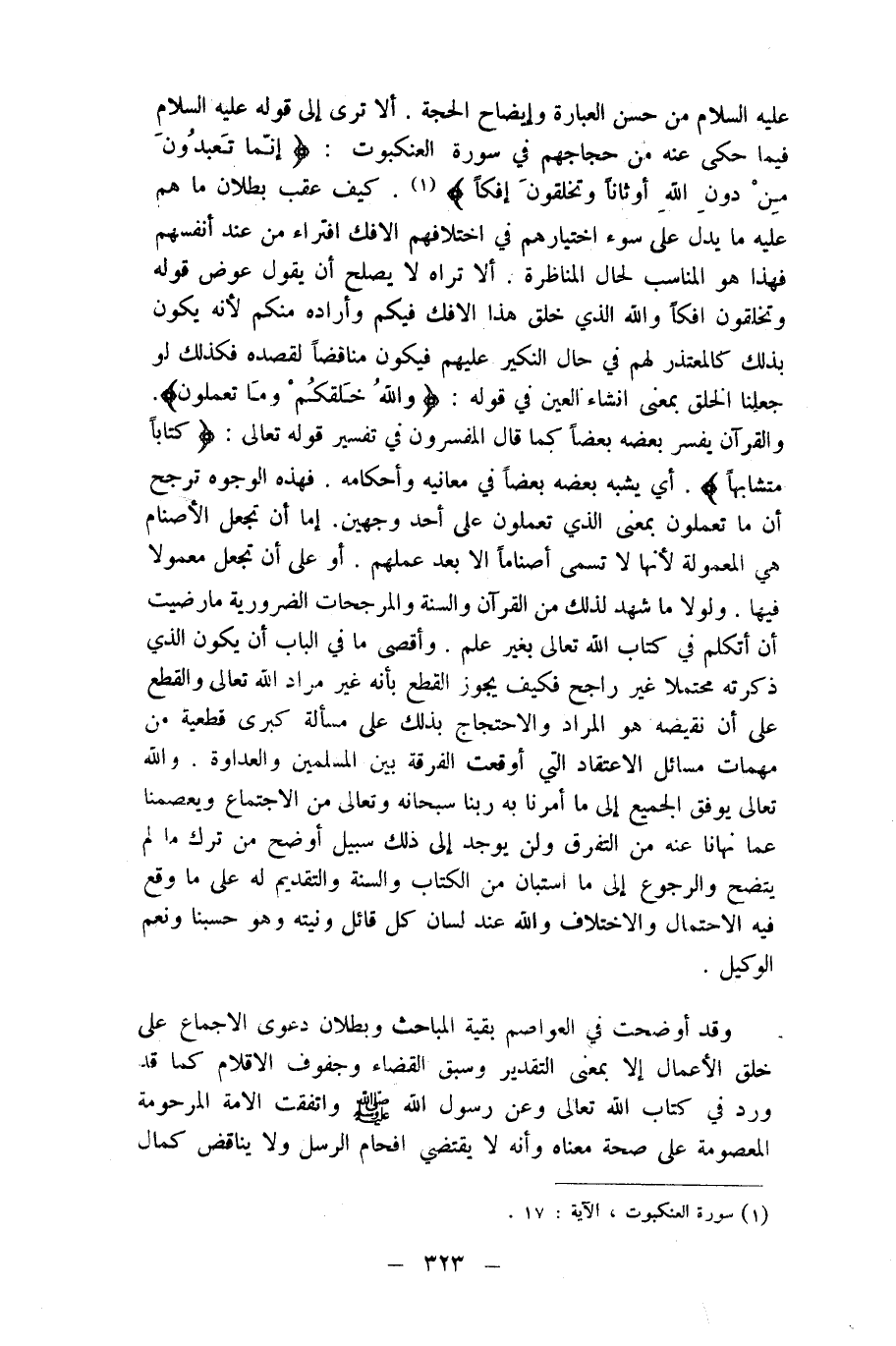 عَلَيْهِ السَّلَام من حسن الْعبارَة وإيضاح الْحجَّة أَلا ترى إِلَى قَوْله عَلَيْهِ السَّلَام فِيمَا حكى عَنهُ من حجاجهم فِي سُورَة العنكبوت {إِنَّمَا تَعْبدُونَ من دون الله أوثانا وتخلقون إفكا} كَيفَ عقب بطلَان مَا هم عَلَيْهِ مَا يدل على سوء اختيارهم فِي اخْتلَافهمْ الافك افتراء من عِنْد أنفسهم فَهَذَا هُوَ الْمُنَاسب لحَال المناظرة أَلا ترَاهُ لَا يصلح أَن يَقُول عوض قَوْله وتخلقون افكا وَالله الَّذِي خلق هَذَا الافك فِيكُم وأراده مِنْكُم لِأَنَّهُ يكون بذلك كالمعتذر لَهُم فِي حَال النكير عَلَيْهِم فَيكون مناقضا لقصده فَكَذَلِك لَو جعلنَا الْخلق بِمَعْنى انشاء الْعين فِي قَوْله {وَالله خَلقكُم وَمَا تَعْمَلُونَ} وَالْقُرْآن يُفَسر بعضه بَعْضًا كَمَا قَالَ الْمُفَسِّرُونَ فِي تَفْسِير قَوْله تَعَالَى {كتابا متشابها} أَي يشبه بعضه بَعْضًا فِي مَعَانِيه وَأَحْكَامه فَهَذِهِ الْوُجُوه ترجح أَن مَا تَعْمَلُونَ بِمَعْنى لذِي تَعْمَلُونَ على أحد وَجْهَيْن إِمَّا أَن تجْعَل الْأَصْنَام هِيَ المعمولة لِأَنَّهَا لَا تسمى أصناما الا بعد عَمَلهم أَو على أَن تجْعَل مَعْمُولا فِيهَا وَلَوْلَا مَا شهد لذَلِك من الْقُرْآن وَالسّنة والمرجحات الضرورية مَا رضيت أَن أَتكَلّم فِي كتاب الله تَعَالَى بِغَيْر علم وأقصى مَا فِي الْبَاب أَن يكون الَّذِي ذكرته مُحْتملا غير رَاجِح فَكيف يجوز الْقطع بِأَنَّهُ غير مُرَاد الله تَعَالَى وَالْقطع على أَن نقيضه هُوَ المُرَاد والاحتجاج بذلك على مَسْأَلَة كبرى قَطْعِيَّة من مهمات مسَائِل الِاعْتِقَاد الَّتِي أوقعت الْفرْقَة بَين الْمُسلمين والعداوة وَالله تَعَالَى يوفق الْجَمِيع إِلَى مَا أمرنَا بِهِ رَبنَا سُبْحَانَهُ وَتَعَالَى من الِاجْتِمَاع ويعصمنا عَمَّا نَهَانَا عَنهُ من التَّفَرُّق وَلنْ يُوجد إِلَى ذَلِك سَبِيل أوضح من ترك مَا لم يَتَّضِح وَالرُّجُوع إِلَى مَا استبان من الْكتاب وَالسّنة والتقديم لَهُ على مَا وَقع فِيهِ الِاحْتِمَال وَالِاخْتِلَاف وَالله عِنْد لِسَان كل قَائِل وَنِيَّته وَهُوَ حَسبنَا وَنعم الْوَكِيل