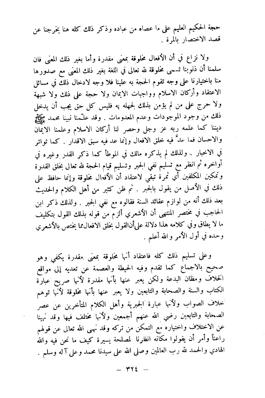 وَلَا نزاع فِي أَن الْأَفْعَال مخلوقة بِمَعْنى مقدرَة وَأما بِغَيْر ذَلِك الْمَعْنى فان سلمنَا أَن ذنوبنا تسمى مخلوقة لله تَعَالَى فِي اللُّغَة بِغَيْر ذَلِك الْمَعْنى مَعَ صدورها منا باختيارنا على وَجه تقوم الْحجَّة بِهِ علينا فَلَا وَجه لادخال ذَلِك فِي مسَائِل الِاعْتِقَاد وأركان الاسلام وواجبات الايمان وَلَا حجَّة على ذَلِك وَلَا شُبْهَة وَلَا حرج على من لم يُؤمن بذلك لجهله بِهِ فَلَيْسَ كل حق يجب أَن يدْخل ذَلِك من وجود الموجودات وَعدم المعدومات وَقد علمنَا نَبينَا مُحَمَّد صلى الله عَلَيْهِ وَسلم ديننَا كَمَا علمه ربه عز وَجل وَحصر لنا أَرْكَان الاسلام وَعلمنَا الايمان والاحسان فَمَا عد فِيهِ خلق الافعال وَإِنَّمَا عد فِيهِ سبق الاقدار كَمَا تَوَاتر فِي الاخبار وَلذَلِك لم يذكرهُ مَالك فِي الْمُوَطَّأ كَمَا ذكر الْقدر وَغَيره فِي أواخره ثمَّ انْظُر مَعَ تَسْلِيم نفي الْجَبْر وَتَسْلِيم قيام الْحجَّة لله تَعَالَى بِخلق الْقُدْرَة وتمكين الْمُكَلّفين أَي ثَمَرَة تبقي لاعتقاد أَن الْأَفْعَال مخلوقة وَإِنَّمَا حَافظ على ذَلِك فِي الأَصْل من يَقُول بالجبر ثمَّ ظن كثير من أهل الْكَلَام والْحَدِيث بعد ذَلِك أَنه من لَوَازِم عقائد السّنة فقالوه مَعَ نفي الْجَبْر وَلذَلِك ذكر ابْن الْحَاجِب فِي مُخْتَصر الْمُنْتَهى أَن الْأَشْعَرِيّ ألزم من قَوْله بذلك القَوْل بتكليف مَا لَا يُطَاق وَفِي كَلَامه هَذَا دلَالَة على أَن القَوْل مِمَّا يخْتَص بالأشعري وَحده فِي أول الْأَمر وَالله أعلم