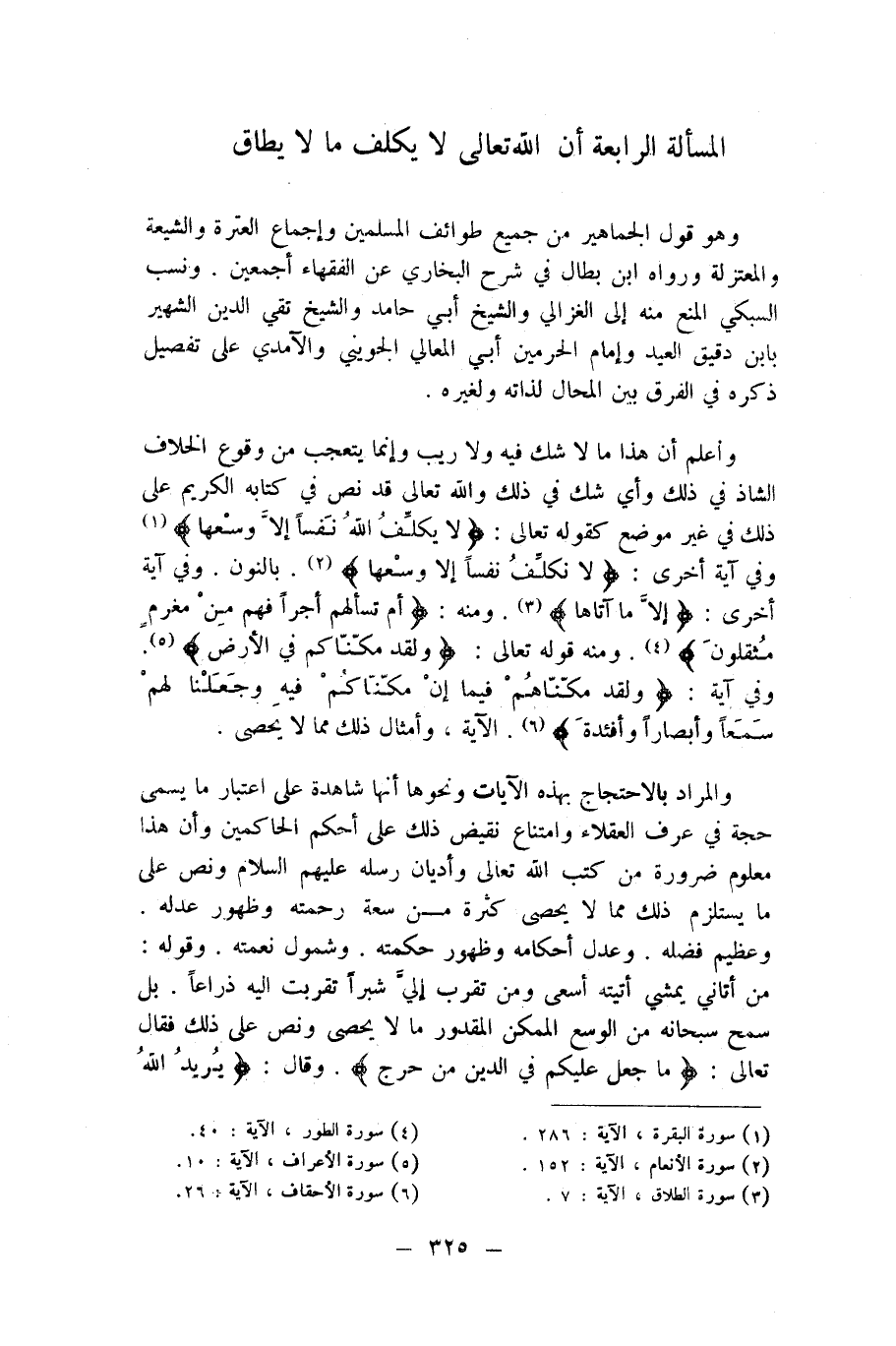الْمَسْأَلَة الرَّابِعَة أَن الله تَعَالَى لَا يُكَلف مَا لَا يُطَاق