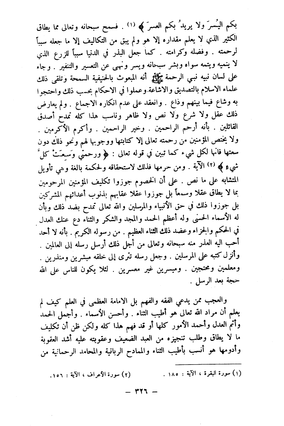 ) فسمح سُبْحَانَهُ وَتَعَالَى مِمَّا يُطَاق الْكثير الَّذِي لَا يعلم مِقْدَاره إِلَّا هُوَ وَلم يبْق من التكاليف إِلَّا مَا جعله سَببا لِرَحْمَتِهِ وفضله وكرامته كَمَا جعل الْبذر فِي الدُّنْيَا سَببا للزَّرْع الَّذِي لَا ينميه ويتمه سواهُ وَبشر سُبْحَانَهُ وَيسر وَنهى عَن التعسير والتنفير وَجَاء على لِسَان نبيه نَبِي الرَّحْمَة صلى الله عَلَيْهِ وَسلم أَنه الْمَبْعُوث بالحنيفية السمحة وتلقى ذَلِك عُلَمَاء الاسلام بالتصديق والاشاعة وَعمِلُوا فِي الاحكام بِحَسب ذَلِك وَاحْتَجُّوا بِهِ وشاع فِيمَا بَينهم وذاع وانعقد على عدم انكاره الاجماع وَلم يُعَارض ذَلِك عقل وَلَا شرع وَلَا نَص وَلَا ظَاهر وناسب هَذَا كُله تمدح أصدق الْقَائِلين بِأَنَّهُ أرْحم الرَّاحِمِينَ وَخير الرَّاحِمِينَ وَأكْرم الأكرمين وَلَا يخْتَص الْمُؤمنِينَ من رَحمته تَعَالَى إِلَّا كتَابَتهَا ووجوبها لَهُم وَنَحْو ذَلِك دون سعتها فانها لكل شَيْء كَمَا تبين فِي قَوْله تَعَالَى {ورحمتي وسعت كل شَيْء} الْآيَة وَمن حرمهَا فَذَلِك لاستحقاقه ولحكمه بَالِغَة وَهِي تَأْوِيل الْمُتَشَابه على مَا نَص على أَن الْخُصُوم جوزوا تَكْلِيف الْمُؤمنِينَ المرحومين بِمَا لَا يُطَاق عقلا وسمعا بل جوزوا عقلا عقابهم بذنوب أعدائهم الْمُشْركين بل جوزوا ذَلِك فِي حق الْأَنْبِيَاء وَالْمُرْسلِينَ وَالله تَعَالَى تمدح بضد ذَلِك وَبِأَن لَهُ الْأَسْمَاء الْحسنى وَله أعظم الْحَمد وَالْمجد وَالشُّكْر وَالثنَاء دع عَنْك الْعدْل فِي الحكم وَالْجَزَاء وعضد ذَلِك الثَّنَاء الْعَظِيم من رَسُوله الْكَرِيم بِأَنَّهُ لَا أحد أحب اليه الْعذر مِنْهُ سُبْحَانَهُ وَتَعَالَى من أجل ذَلِك أرسل رسله إِلَى الْعَالمين وَأنزل كتبه على الْمُرْسلين وَجعل رسله تترى إِلَى خلقه مبشرين ومنذرين ومعلمين ومحتجين وميسرين غير معسرين لِئَلَّا يكون للنَّاس على الله حجَّة بعد الرُّسُل