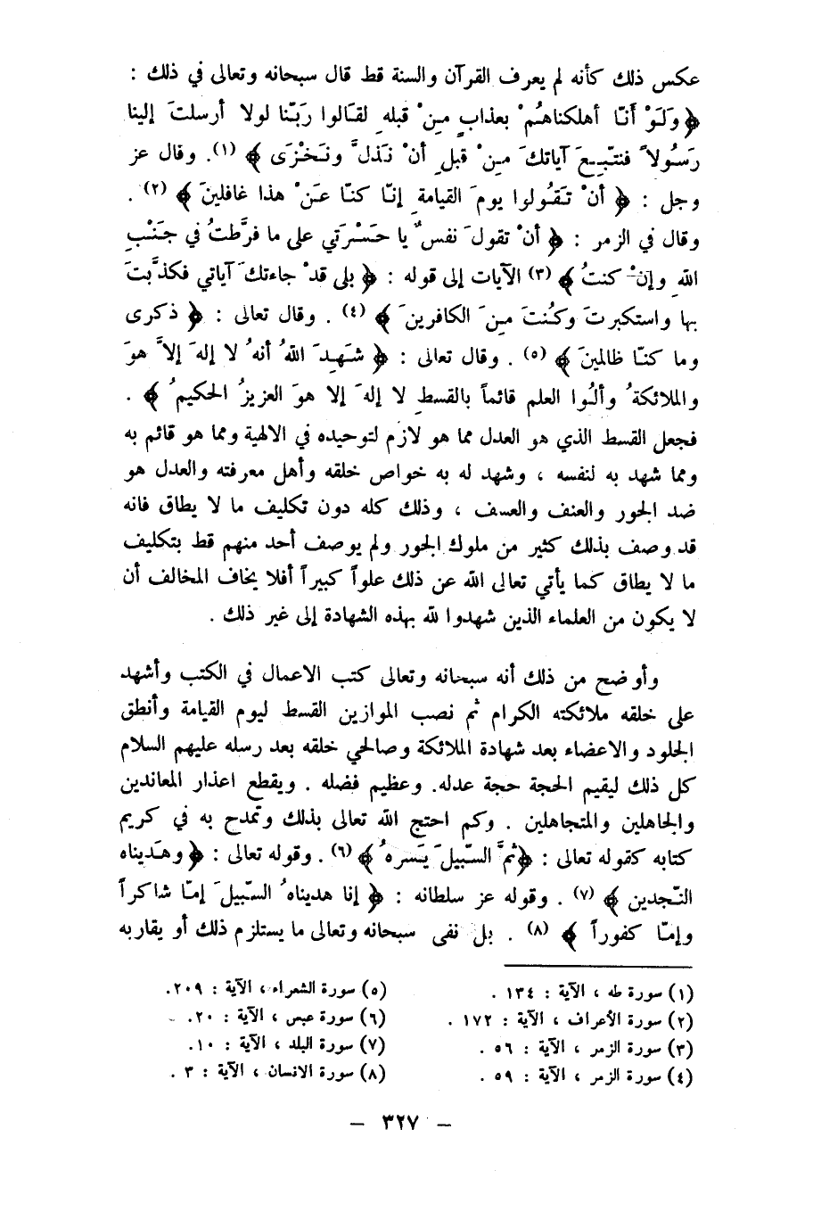 عكس ذَلِك كَأَنَّهُ لم يعرف الْقُرْآن وَالسّنة قطّ قَالَ سُبْحَانَهُ وَتَعَالَى فِي ذَلِك {وَلَو أَنا أهلكناهم بِعَذَاب من قبله لقالوا رَبنَا لَوْلَا أرْسلت إِلَيْنَا رَسُولا فنتبع آياتك من قبل أَن نذل ونخزى} وَقَالَ عز وَجل {أَن تَقولُوا يَوْم الْقِيَامَة إِنَّا كُنَّا عَن هَذَا غافلين} وَقَالَ فِي الزمر {أَن تَقول نفس يَا حسرتى على مَا فرطت فِي جنب الله وَإِن كنت} الْآيَات إِلَى قَوْله {بلَى قد جاءتك آياتي فَكَذبت بهَا واستكبرت وَكنت من الْكَافرين} وَقَالَ تَعَالَى {ذكرى وَمَا كُنَّا ظالمين} وَقَالَ تَعَالَى {شهد الله أَنه لَا إِلَه إِلَّا هُوَ وَالْمَلَائِكَة وأولو الْعلم قَائِما بِالْقِسْطِ لَا إِلَه إِلَّا هُوَ الْعَزِيز الْحَكِيم} فَجعل الْقسْط الَّذِي هُوَ الْعدْل مِمَّا هُوَ لَازم لتوحيده فِي الالهية وَمِمَّا هُوَ قَائِم بِهِ وَمِمَّا شهد بِهِ لنَفسِهِ وَشهد لَهُ بِهِ خَواص خلقه وَأهل مَعْرفَته وَالْعدْل هُوَ ضد الْجور والعنف والعسف وَذَلِكَ كُله دون تَكْلِيف مَا لَا يُطَاق فانه قد وصف بذلك كثير من مُلُوك الْجور وَلم يُوصف أحد مِنْهُم قطّ بتكليف مَا لَا يُطَاق كَمَا يَأْتِي تَعَالَى الله عَن ذَلِك علوا كَبِيرا أَفلا يخَاف الْمُخَالف أَن لَا يكون من الْعلمَاء الَّذين شهدُوا لله بِهَذِهِ الشَّهَادَة إِلَى غير ذَلِك