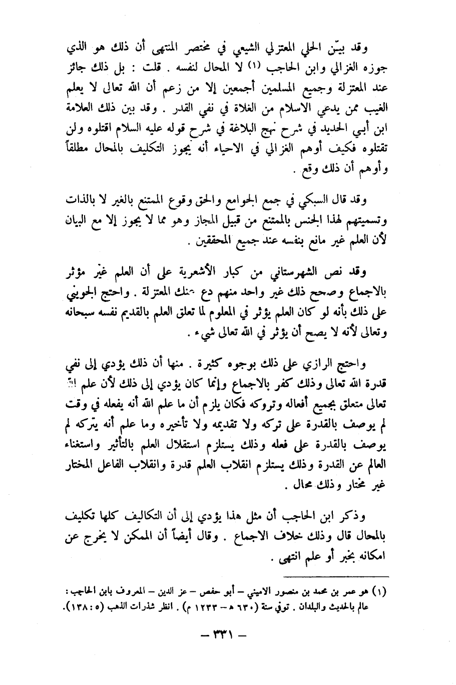 وَقد بَين الْحلِيّ المعتزلي الشيعي فِي مُخْتَصر الْمُنْتَهى أَن ذَلِك هُوَ الَّذِي جوزه الْغَزالِيّ وَابْن الْحَاجِب لَا الْمحَال لنَفسِهِ قلت بل ذَلِك جَائِز عِنْد الْمُعْتَزلَة وَجَمِيع الْمُسلمين أَجْمَعِينَ إِلَّا من زعم أَن الله تَعَالَى لَا يعلم الْغَيْب مِمَّن يَدعِي الاسلام من الغلاة فِي نفي الْقدر وَقد بَين ذَلِك الْعَلامَة ابْن أبي الْحَدِيد فِي شرح نهج البلاغة فِي شرح قَوْله عَلَيْهِ السَّلَام اقْتُلُوهُ وَلنْ تقتلوه فَكيف أوهم الْغَزالِيّ فِي الاحياء أَنه يجوز التَّكْلِيف بالمحال مُطلقًا وأوهم أَن ذَلِك وَقع