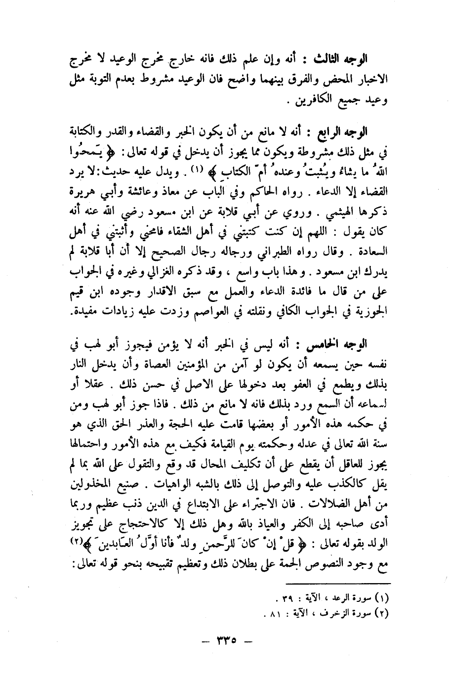 الْوَجْه الرَّابِع أَنه لَا مَانع من أَن يكون الْخَبَر وَالْقَضَاء وَالْقدر وَالْكِتَابَة فِي مثل ذَلِك مَشْرُوطَة وَيكون مِمَّا يجوز أَن يدْخل فِي قَوْله تَعَالَى {يمحو الله مَا يَشَاء وَيثبت وَعِنْده أم الْكتاب} وَيدل عَلَيْهِ حَدِيث لَا يرد الْقَضَاء إِلَّا الدُّعَاء رَوَاهُ الْحَاكِم وَفِي الْبَاب عَن معَاذ وَعَائِشَة وَأبي هُرَيْرَة ذكرهَا الهيثمي وَرُوِيَ عَن أبي قلَابَة عَن ابْن مَسْعُود رَضِي الله عَنهُ أَنه كَانَ يَقُول اللَّهُمَّ إِن كنت كتبتني فِي أهل الشَّقَاء فامحني وأثبتني فِي أهل السَّعَادَة وَقَالَ رَوَاهُ الطَّبَرَانِيّ وَرِجَاله رجال الصَّحِيح إِلَّا أَن أَبَا قلَابَة لم يدْرك ابْن مَسْعُود وَهَذَا بَاب وَاسع وَقد ذكره الْغَزالِيّ وَغَيره فِي الْجَواب على مَا من قَالَ مَا فَائِدَة الدُّعَاء وَالْعَمَل مَعَ سبق الاقدار وجوده ابْن قيم الجوزية فِي الْجَواب الْكَافِي ونقلته فِي العواصم وزدت عَلَيْهِ زيادات مفيدة