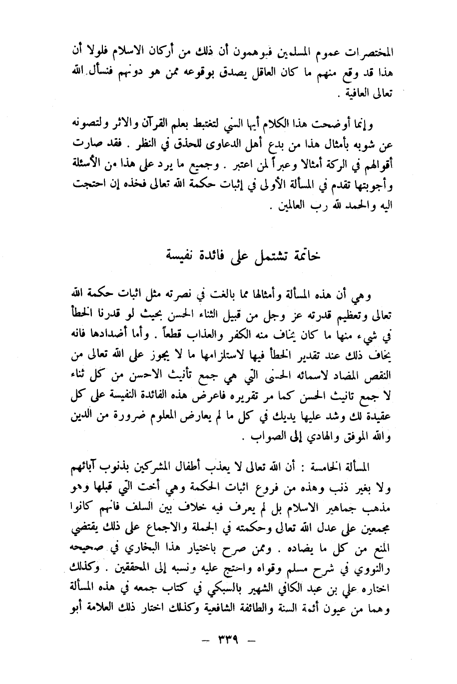 الْمَسْأَلَة الْخَامِسَة أَن الله تَعَالَى لَا يعذب أَطْفَال الْمُشْركين بذنوب آبَائِهِم وَلَا بِغَيْر ذَنْب وَهَذِه من فروع اثبات الْحِكْمَة وَهِي أُخْت الَّتِي قبلهَا وَهُوَ مَذْهَب جَمَاهِير الاسلام بل لم يعرف فِيهِ خلاف بَين السّلف فانهم كَانُوا مُجْمِعِينَ على عدل الله تَعَالَى وحكمته فِي الْجُمْلَة والاجماع على ذَلِك يتقضي الْمَنْع من كل مَا يضاده وَمِمَّنْ صرح بِاخْتِيَار هَذَا البُخَارِيّ فِي صَحِيحه وَالنَّوَوِيّ فِي شرح مُسلم وَقواهُ وَاحْتج عَلَيْهِ وَنسبه إِلَى الْمُحَقِّقين وَكَذَلِكَ اخْتَارَهُ عَليّ بن عبد الْكَافِي الشهير بالسبكي فِي كتاب جمعه فِي هَذِه الْمَسْأَلَة وهما من عُيُون أَئِمَّة السّنة والطائفة الشَّافِعِيَّة وَكَذَلِكَ اخْتَار ذَلِك الْعَلامَة أَبُو