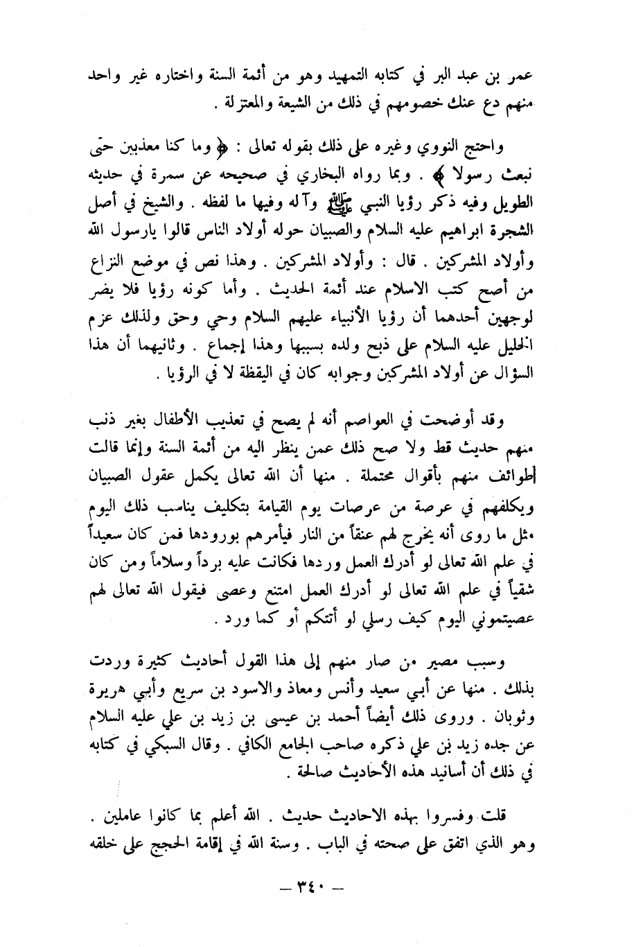 وَقد أوضحت فِي العواصم أَنه لم يَصح فِي تَعْذِيب الْأَطْفَال بِغَيْر ذَنْب مِنْهُم حَدِيث قطّ وَلَا صَحَّ ذَلِك عَمَّن ينظر اليه من أَئِمَّة السّنة وَإِنَّمَا قَالَت طوائف مِنْهُم بأقوال مُحْتَملَة مِنْهَا أَن الله تَعَالَى يكمل عقول الصّبيان ويكلفهم فِي عَرصَة من عرصات يَوْم الْقِيَامَة بتكيلف يُنَاسب ذَلِك الْيَوْم مثل مَا روى أَنه يخرج لَهُم عنقًا من النَّار فيأمرهم بورودها فَمن كَانَ سعيدا فِي علم الله تَعَالَى لَو أدْرك الْعَمَل وردهَا فَكَانَت عَلَيْهِ بردا وَسلَامًا وَمن كَانَ شقيا فِي علم الله تَعَالَى لَو أدْرك الْعَمَل امْتنع وَعصى فَيَقُول الله تَعَالَى لَهُم عصيتموني الْيَوْم كَيفَ رُسُلِي لَو أتتكم أَو كَمَا ورد