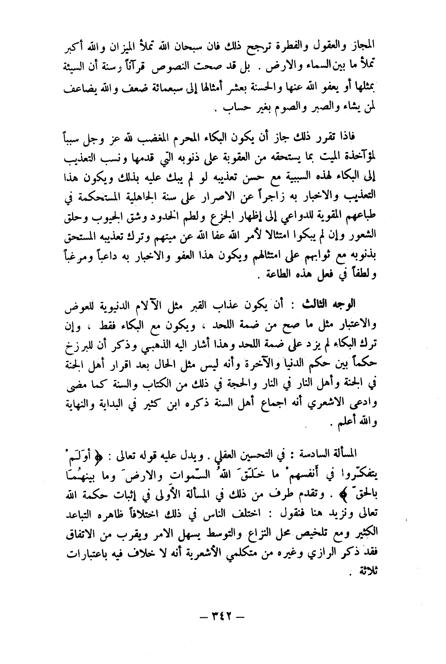 الْوَجْه الثَّالِث أَن يكون عَذَاب الْقَبْر مثل الآلام الدُّنْيَوِيَّة للعوض وَالِاعْتِبَار مثل مَا صَحَّ من ضمة اللَّحْد وَيكون مَعَ بكاء فَقَط وَإِن ترك الْبكاء لم يزدْ على ضمة اللَّحْد وَهَذَا أَشَارَ اليه الذَّهَبِيّ وَذكر أَن للبرزخ حكما بَين حكم الدُّنْيَا وَالْآخِرَة وَأَنه لَيْسَ مثل الْحَال بعد اقرار أهل الْجنَّة فِي الْجنَّة وَأهل النَّار فِي النَّار وَالْحجّة فِي ذَلِك من الْكتاب وَالسّنة كَمَا مضى وَادّعى الاشعري أَنه اجماع أهل السّنة ذكره ابْن كثير فِي الْبِدَايَة وَالنِّهَايَة وَالله أعلم