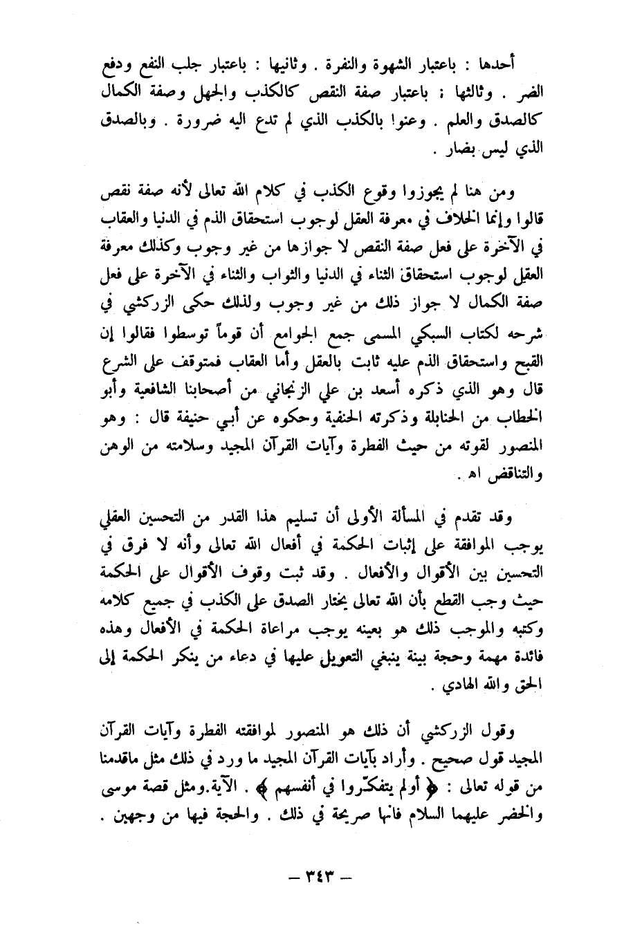 وَمن هُنَا لم يجوزوا وُقُوع الْكَذِب فِي كَلَام الله تَعَالَى لِأَنَّهُ صفة نقص قَالُوا وَإِنَّمَا الْخلاف فِي معرفَة الْعقل لوُجُوب اسْتِحْقَاق الذَّم فِي الدُّنْيَا وَالْعِقَاب فِي الْآخِرَة على فعل صفة النَّقْص لَا جوزها من غير وجوب وَكَذَلِكَ معرفَة الْعقل لوُجُوب اسْتِحْقَاق الثَّنَاء فِي الدُّنْيَا وَالثَّوَاب وَالثنَاء فِي الْآخِرَة على فعل صفة الْكَمَال لَا جَوَاز ذَلِك من غير وجوب وَلذَلِك حكى الزَّرْكَشِيّ فِي شَرحه لكتاب السُّبْكِيّ الْمُسَمّى جمع الْجَوَامِع أَن قوما توسطوا فَقَالُوا إِن الْقبْح وَاسْتِحْقَاق الذَّم عَلَيْهِ ثَابت بِالْعقلِ وَأما الْعقَاب فمتوقف على الشَّرْع قَالَ وَهُوَ الَّذِي ذكره أسعد بن عَليّ الزنجاني من أَصْحَابنَا الشَّافِعِيَّة وَأَبُو الْخطاب من الْحَنَابِلَة وذكرته الْحَنَفِيَّة وحكوه عَن أبي حنيفَة قَالَ وَهُوَ الْمَنْصُور لقُوته من حَيْثُ الْفطْرَة وآيات الْقُرْآن الْمجِيد وسلامته من الوهن والتناقض اه