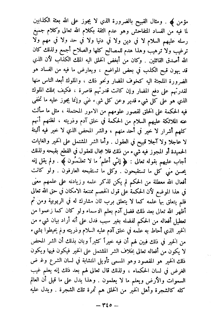 ) وَمِثَال الْقَبِيح بِالضَّرُورَةِ الَّذِي لَا يجوز على الله بعثة الْكَذَّابين لما فِيهِ من الْفساد المتفاحش وَهُوَ عدم الثِّقَة بِكَلَام الله تَعَالَى وَكَلَام جَمِيع رسله عَلَيْهِم السَّلَام لَا فِي دين وَلَا فِي دنيا وَلَا فِي حد وَلَا فِي مُهِمّ وَلَا ترغيب وَلَا ترهيب وَهَذَا هدم للْمصَالح كلهَا وَالصَّلَاح أجمع وَلذَلِك كَانَ الله أصدق الْقَائِلين وَكَانَ من أبْغض الْخلق اليه الْملك الْكذَّاب لِأَن الَّذِي قد يهون قبح الْكَذِب فِي بعض الْمَوَاضِع ويعارض مَا فِيهِ من الْفساد هُوَ الضَّرُورَة الملجئة اليه كخوف المضار وَنَحْو ذَلِك والملوك أبعد النَّاس مِنْهَا لقدرتهم على دفع المضار وَإِن كَانَت قدرتهم قَاصِرَة فَكيف بِملك الْمُلُوك الَّذِي هُوَ على كل شَيْء قدير وَعَن كل شَيْء غَنِي وَإِنَّمَا يجوز عَلَيْهِ مَا تخفى فِيهِ الْحِكْمَة على الْخلق لقُصُور علومهم من الامور المحتملة مثل مَا سَأَلت عَنهُ الْمَلَائِكَة عَلَيْهِم السَّلَام من الْحِكْمَة فِي خلق آدم وَذريته لظنهم أَنهم كلهم أشرار لَا خير فِي أحد مِنْهُم وَالشَّر الْمَحْض الَّذِي لَا خير فِيهِ أَلْبَتَّة لَا عَاجلا وَلَا آجلا قَبِيح فِي الْعُقُول وَأما الشَّرّ الْمُشْتَمل على الْخَيْر والغايات الحميدة أَو المجوز فِيهِ شَيْء من ذَلِك فَلَا مجَال للعقول فِي الْقطع بقبحه وَلذَلِك أجَاب عَلَيْهِم بقوله تَعَالَى {إِنِّي أعلم مَا لَا تعلمُونَ} وَلم يقل إِنَّه يحسن مني كل مَا تستقبحون وكل مَا تستقبحه العارفون وَلَو كَانَت أَفعَال الله معطلة من الحكم لم يكن لذكر علمه وزيادته على علمهمْ معنى فِي هَذَا الْموضع لِأَن الْحِكْمَة على قَول الْخصم ممتنعة الامكان فِي حق الله تَعَالَى فَلم يتَعَلَّق بهَا علمه كَمَا لَا يتَعَلَّق بِرَبّ ثَان مشارك لَهُ فِي الربوبية وَمن ثمَّ أظهر الله تَعَالَى بعد ذَلِك فضل آدم بِعلم الاسماء وَلَو كَانَ كَمَا زَعَمُوا من تَعْطِيل أَفعاله من الحكم لفضله بِغَيْر سَبَب فَدلَّ على أَنه أَرَادَ بِبَيَان شَيْء من الْخَيْر الَّذِي أحَاط بِهِ علمه فِي خلق آدم عَلَيْهِ السَّلَام وَذريته وَلم يحيطوا بِشَيْء من الْخَيْر فِي ذَلِك فَبين لَهُم أَن فِيهِ خيرا كثيرا وَبَان بذلك أَن الشَّرّ الْمَحْض لَا يكون من أَفعاله تَعَالَى بِخِلَاف الشَّرّ الْمُشْتَمل على الْخَيْر فَيكون فِيهَا وَيكون ذَلِك الْخَيْر هُوَ الْمَقْصُود وَهُوَ الْمُسَمّى تَأْوِيل المتشابة فِي لِسَان الشَّرْع وغرض الْغَرَض فِي لِسَان الْحُكَمَاء وَلذَلِك قَالَ تَعَالَى لَهُم بعد ذَلِك إِنَّه يعلم غيب السَّمَوَات وَالْأَرْض وَيعلم مَا لَا يعلمُونَ وَهَذَا يدل على مَا قيل أَن الْعَالم كُله كالشجرة وَأهل الْخَيْر من الْخلق هم ثَمَرَة تِلْكَ الشَّجَرَة وَيدل عَلَيْهِ