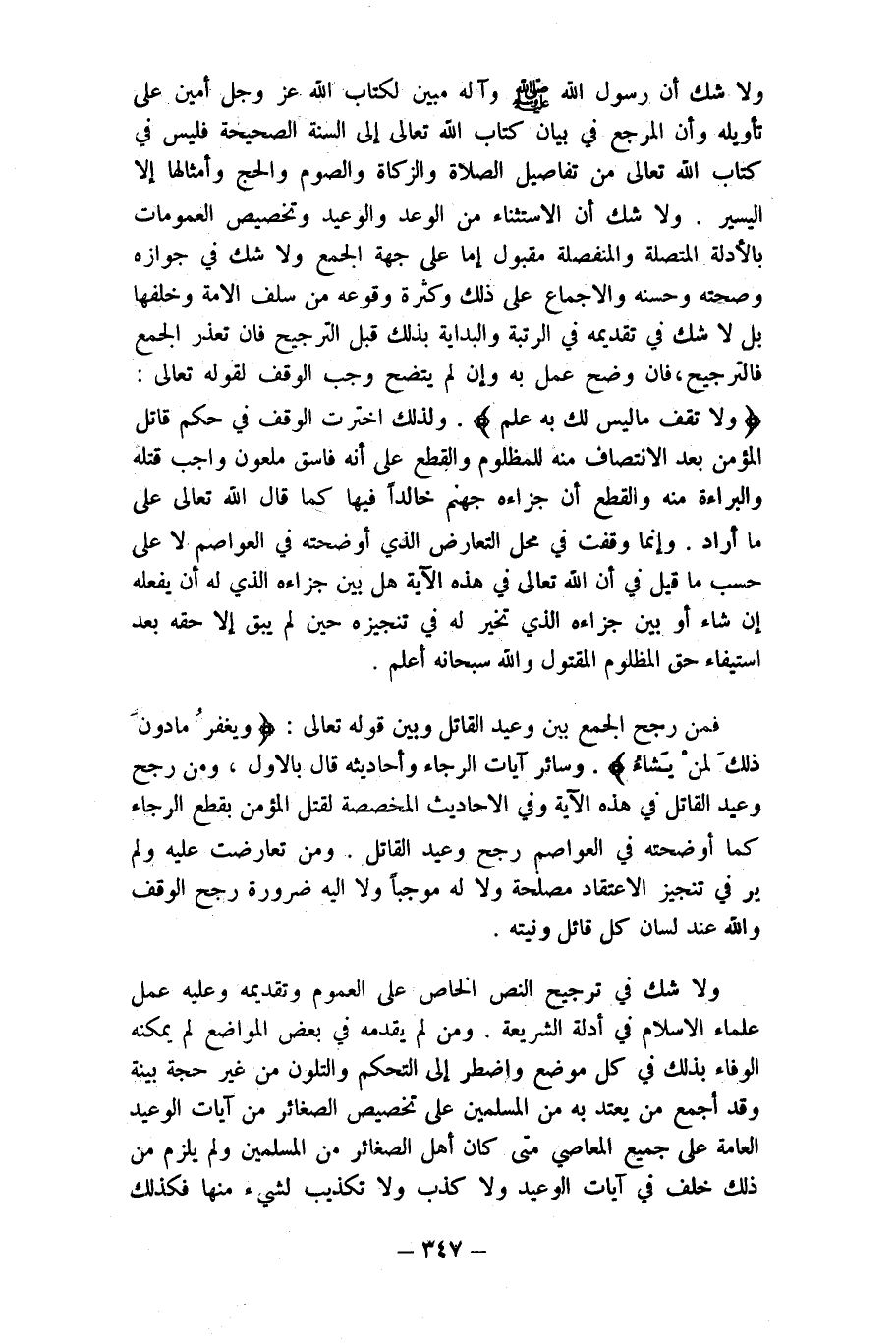 فَمن رجح الْجمع بَين وَعِيد الْقَاتِل وَبَين قَوْله تَعَالَى {وَيغْفر مَا دون ذَلِك لمن يَشَاء} وَسَائِر آيَات الرَّجَاء وَأَحَادِيثه قَالَ بالاول وَمن رجح وَعِيد الْقَاتِل فِي هَذِه الْآيَة وَفِي الاحاديث المخصصة لقتل الْمُؤمن بِقطع الرَّجَاء كَمَا أوضحته فِي العواصم رجح وَعِيد الْقَاتِل وَمن تَعَارَضَت عَلَيْهِ وَلم ير فِي تَنْجِيز الِاعْتِقَاد مصلحَة وَلَا لَهُ مُوجبا وَلَا اليه ضَرُورَة رجح الْوَقْف وَالله عِنْد لِسَان كل قَائِل وَنِيَّته
