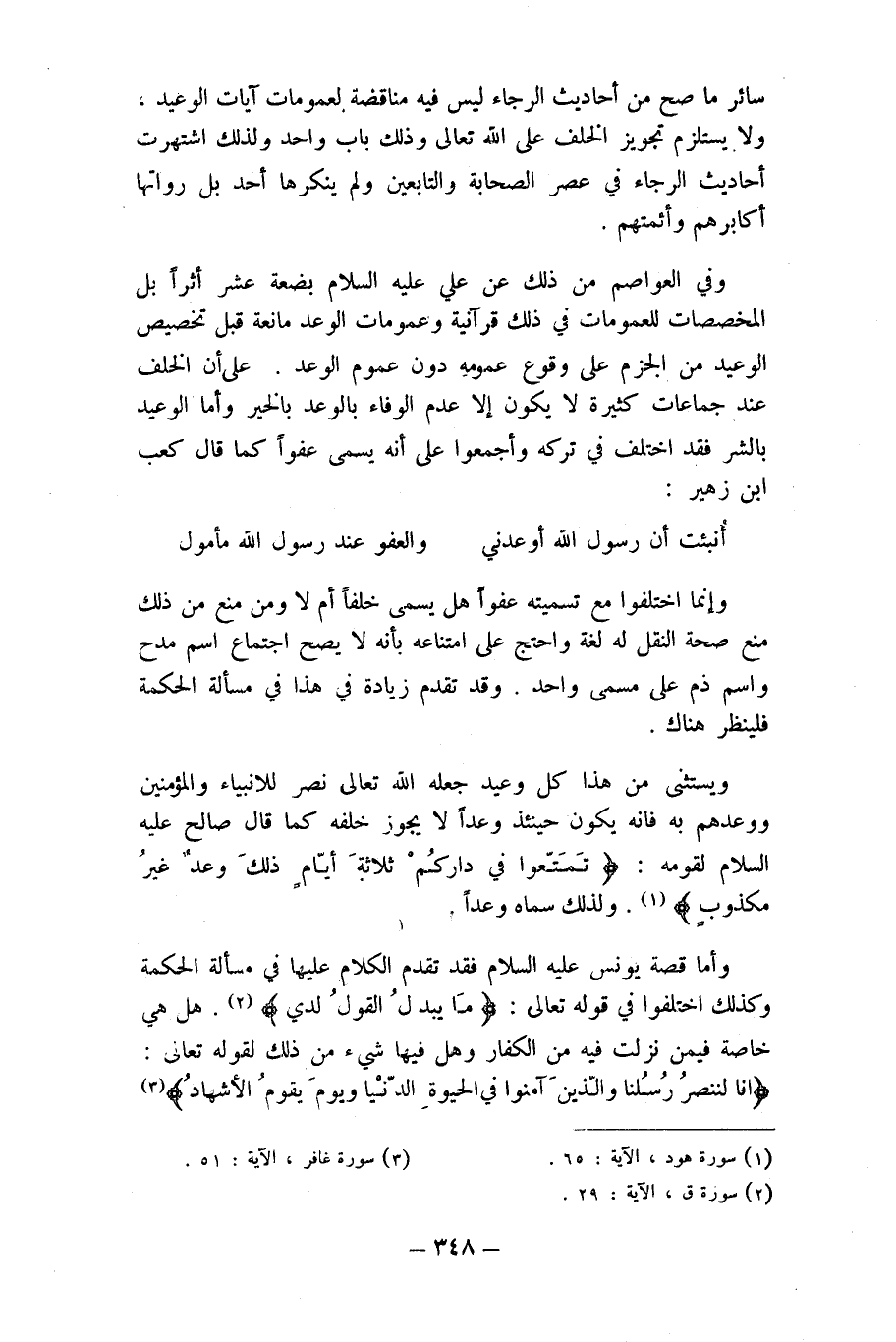 وَفِي العواصم من ذَلِك عَن عَليّ عَلَيْهِ السَّلَام بضعَة عشر أثرا بل المخصصات للعمومات فِي ذَلِك قرآنية وعمومات الْوَعْد مَانِعَة قبل تَخْصِيص الْوَعيد من الْجَزْم على وُقُوع عُمُومه دون عُمُوم الْوَعْد على أَن الْخلف عِنْد جماعات كَثِيرَة لَا يكون إِلَّا عدم الْوَفَاء بالوعد بِالْخَيرِ وَأما الْوَعيد بِالشَّرِّ فقد اخْتلف فِي تَركه وَأَجْمعُوا على أَنه يُسمى عفوا كَمَا قَالَ كَعْب ابْن زُهَيْر
