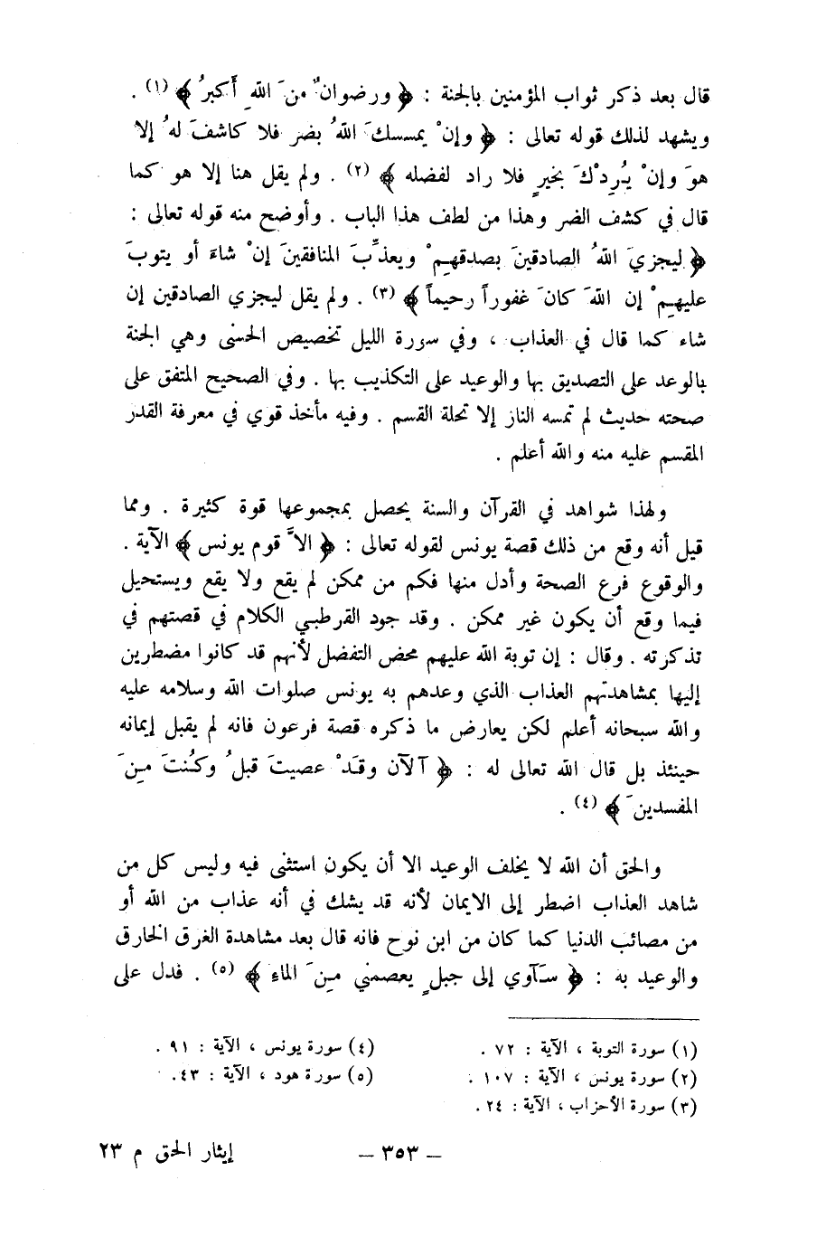 قَالَ بعد ذكر ثَوَاب الْمُؤمنِينَ بِالْجنَّةِ {ورضوان من الله أكبر} وَيشْهد لذَلِك قَوْله تَعَالَى {وَإِن يمسسك الله بضر فَلَا كاشف لَهُ إِلَّا هُوَ وَإِن يردك بِخَير فَلَا راد لفضله} وَلم يقل هُنَا إِلَّا هُوَ كَمَا قَالَ فِي كشف الضّر وَهَذَا من لطف هَذَا الْبَاب وأوضح مِنْهُ قَوْله تَعَالَى {ليجزي الله الصَّادِقين بصدقهم ويعذب الْمُنَافِقين إِن شَاءَ أَو يَتُوب عَلَيْهِم إِن الله كَانَ غَفُورًا رحِيما} وَلم يقل ليجزي الصَّادِقين إِن شَاءَ كَمَا قَالَ فِي الْعَذَاب وَفِي سُورَة اللَّيْل تَخْصِيص الْحسنى وَهِي الْجنَّة بالوعد على التَّصْدِيق بهَا والوعيد على التَّكْذِيب بهَا وَفِي الصَّحِيح الْمُتَّفق على صِحَّته حَدِيث لم تمسه النَّار إِلَّا تَحِلَّة الْقسم وَفِيه مَأْخَذ قوي فِي معرفَة الْقدر الْمقسم عَلَيْهِ مِنْهُ وَالله أعلم