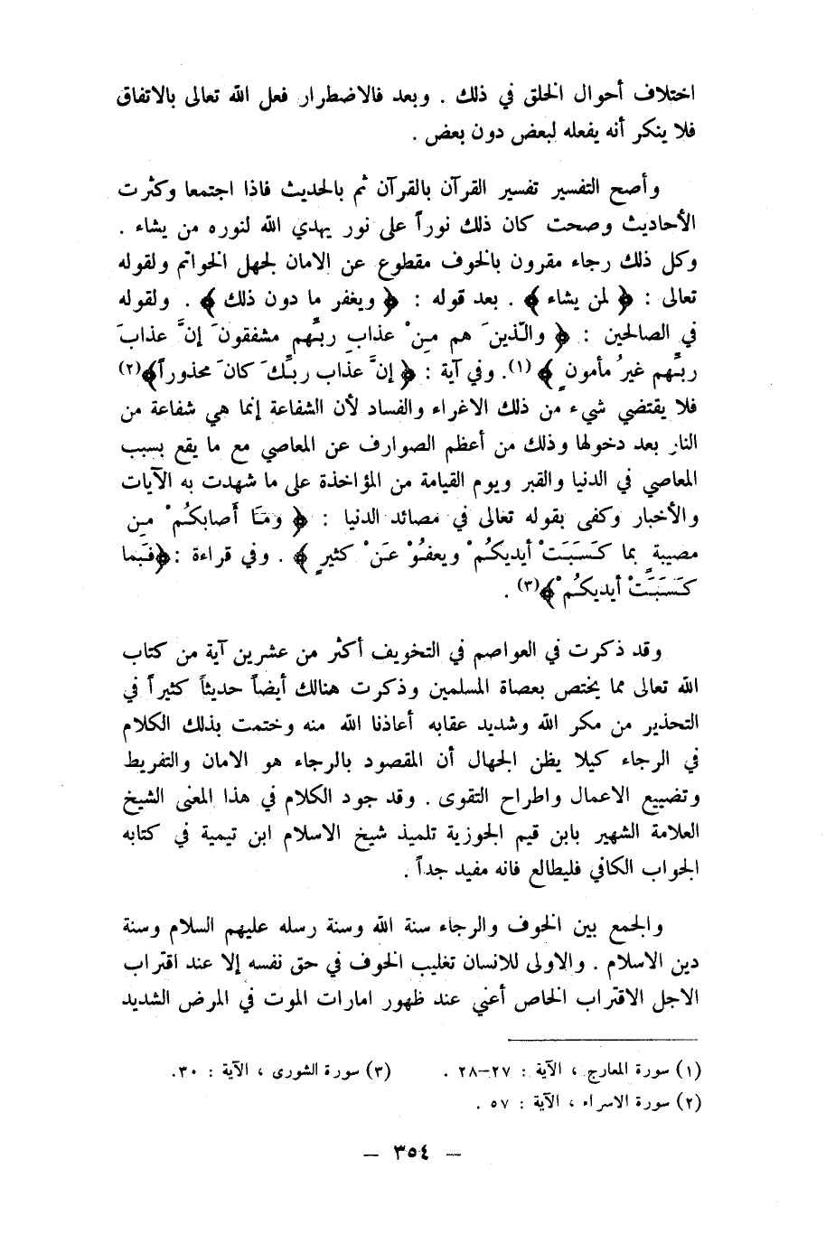 وَقد ذكرت فِي العواصم فِي التخويف أَكثر من عشْرين آيَة من كتاب الله تعالي مِمَّا يخْتَص بعصاة الْمُسلمين وَذكرت هُنَالك أَيْضا حَدِيثا كثيرا فِي التحذير من مكر الله وشديد عِقَابه أعاذنا الله مِنْهُ وختمت بذلك الْكَلَام فِي الرَّجَاء كَيْلا يظنّ الْجُهَّال أَن الْمَقْصُود بالرجاء هُوَ الامان والتفريط وتضييع الاعمال واطراح التقوي وَقد جود الْكَلَام فِي هَذَا المعني الشَّيْخ الْعَلامَة الشهير بِابْن قيم الجوزية تلميذ شيخ الاسلام ابْن تَيْمِية فِي كِتَابه الْجَواب الْكَافِي فليطالع فانه مُفِيد جدا