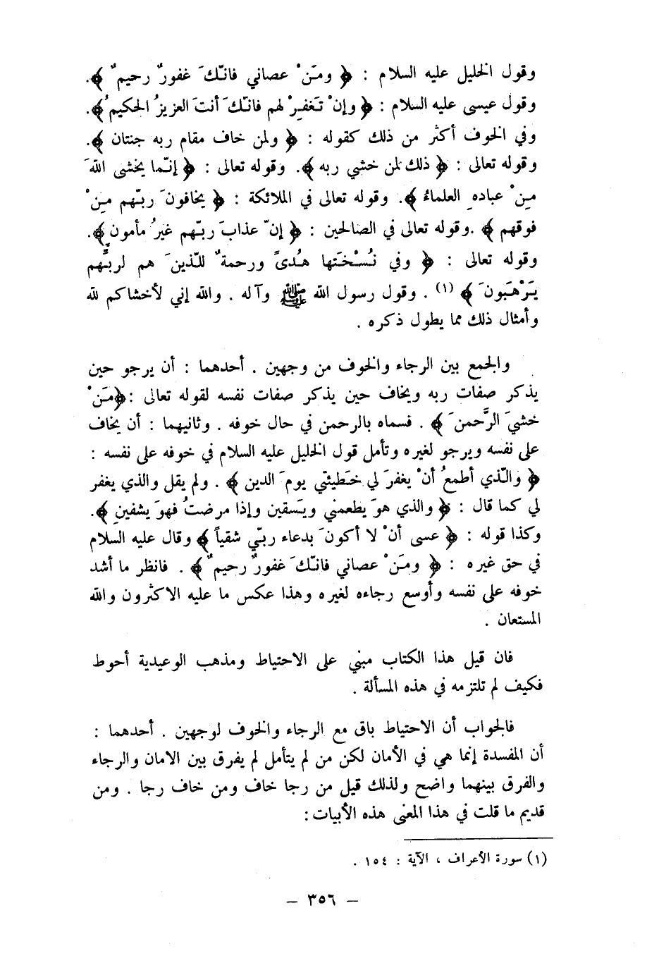 وَقَول الْخَلِيل عَلَيْهِ السَّلَام {وَمن عَصَانِي فَإنَّك غَفُور رَحِيم} وَقَول عيسي عَلَيْهِ السَّلَام {وَإِن تغْفر لَهُم فَإنَّك أَنْت الْعَزِيز الْحَكِيم} وَفِي الْخَوْف أَكثر من ذَلِك كَقَوْلِه {وَلمن خَافَ مقَام ربه جنتان} وَقَوله تعالي {ذَلِك لمن خشِي ربه} وَقَوله تَعَالَى {إِنَّمَا يخْشَى الله من عباده الْعلمَاء} وَقَوله تعالي فِي الْمَلَائِكَة {يخَافُونَ رَبهم من فَوْقهم} وَقَوله تَعَالَى فِي الصَّالِحين {إِن عَذَاب رَبهم غير مَأْمُون} وَقَوله تَعَالَى {وَفِي نسختها هدى وَرَحْمَة للَّذين هم لرَبهم يرهبون} وَقَول رَسُول الله صلى الله عَلَيْهِ وَسلم وَآله وَالله إِنِّي لأخشاكم لله وأمثال ذَلِك مِمَّا يطول ذكره