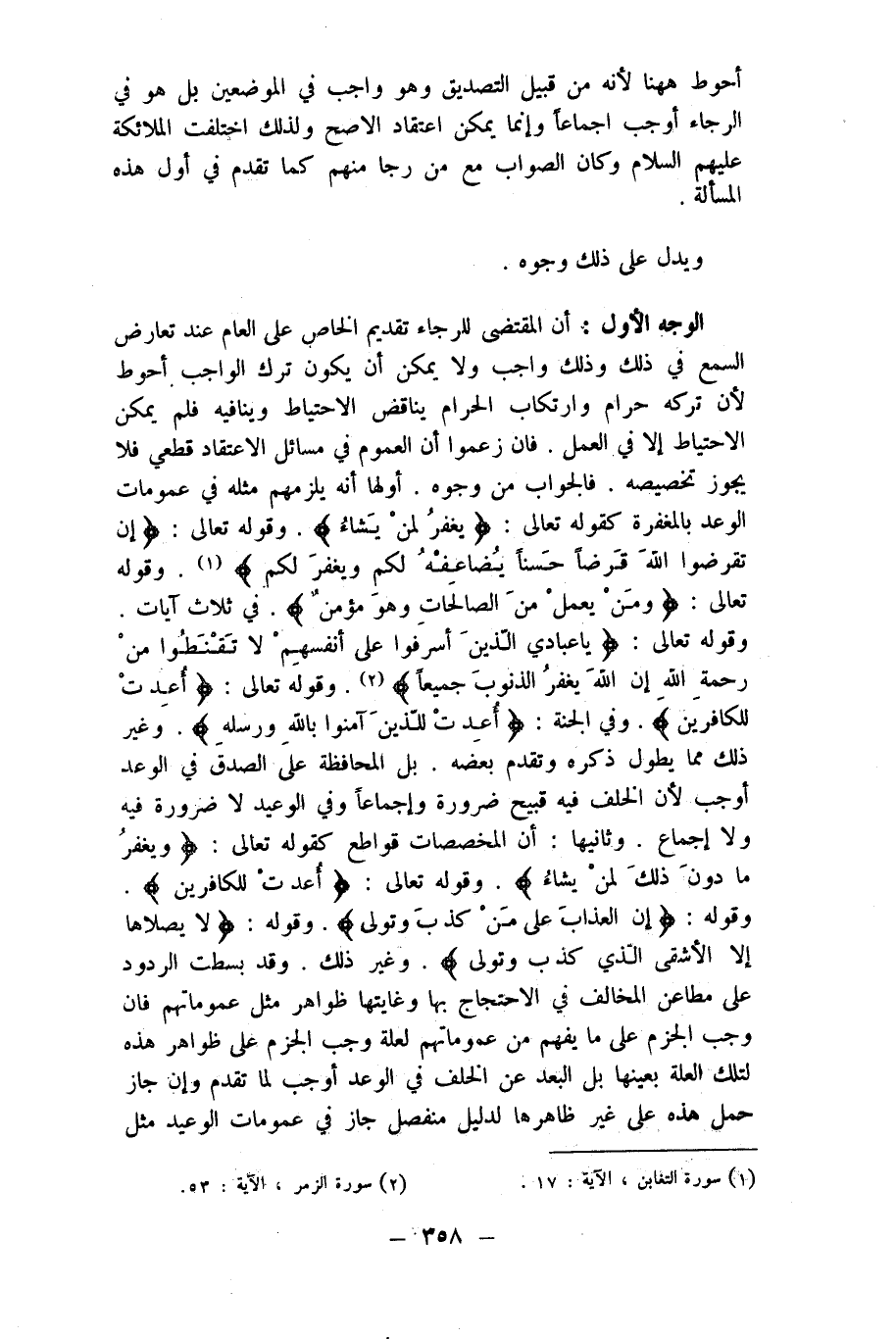 الْوَجْه الأول أَن الْمُقْتَضِي للرجاء تَقْدِيم الْخَاص على الْعَام عِنْد تعَارض السّمع فِي ذَلِك وَذَلِكَ وَاجِب وَلَا يُمكن أَن يكون ترك الْوَاجِب أحوط لِأَن تَركه حرَام وارتكاب الْحَرَام يُنَاقض الِاحْتِيَاط وينافيه فَلم يُمكن الِاحْتِيَاط إِلَّا فِي الْعَمَل فان زَعَمُوا ان الْعُمُوم فِي مسَائِل الِاعْتِقَاد قَطْعِيّ فَلَا يجوز تَخْصِيصه فَالْجَوَاب من وُجُوه أَولهَا أَنه يلْزمهُم مثله فِي عمومات الْوَعْد بالمغفرة كَقَوْلِه تَعَالَى {يغْفر لمن يَشَاء} وَقَوله تَعَالَى {إِن تقرضوا الله قرضا حسنا يضاعفه لكم وَيغْفر لكم} وَقَوله تَعَالَى (وَمن يعْمل من الصَّالِحَات وَهُوَ مُؤمن) فِي ثَلَاث آيَات وَقَوله تَعَالَى {يَا عبَادي الَّذين أَسْرفُوا على أنفسهم لَا تقنطوا من رَحْمَة الله إِن الله يغْفر الذُّنُوب جَمِيعًا} وَقَوله تَعَالَى {أعدت للْكَافِرِينَ} وَفِي الْجنَّة {أعدت للَّذين آمنُوا بِاللَّه وَرُسُله} وَغير ذَلِك مِمَّا يطول ذكره وَتقدم بعضه بل الْمُحَافظَة على الصدْق فِي الْوَعْد أوجب لِأَن الْخلف فِيهِ قَبِيح ضَرُورَة وإجماعا وَفِي الْوَعيد لَا ضَرُورَة فِيهِ وَلَا إِجْمَاع وَثَانِيها ان المخصصات قواطع كَقَوْلِه تَعَالَى {وَيغْفر مَا دون ذَلِك لمن يَشَاء} وَقَوله تَعَالَى {أعدت للْكَافِرِينَ} وَقَوله {أَن الْعَذَاب على من كذب وَتَوَلَّى} وَقَوله {لَا يصلاها إِلَّا الأشقى الَّذِي كذب وَتَوَلَّى} وَغير ذَلِك وَقد بسطت الردود على مطاعن الْمُخَالف فِي الِاحْتِجَاج بهَا وغايتها ظواهر مثل عموماتهم فان وَجب الْجَزْم على مَا يفهم من عموماتهم لعِلَّة وَجب الْجَزْم على ظواهر هَذِه لتِلْك الْعلَّة بِعَينهَا بل الْبعد عَن الْخلف فِي الْوَعْد أوجب لما تقدم وَإِن جَازَ حمل هَذِه على غير ظَاهرهَا لدَلِيل مُنْفَصِل جَازَ فِي عمومات الْوَعيد مثل