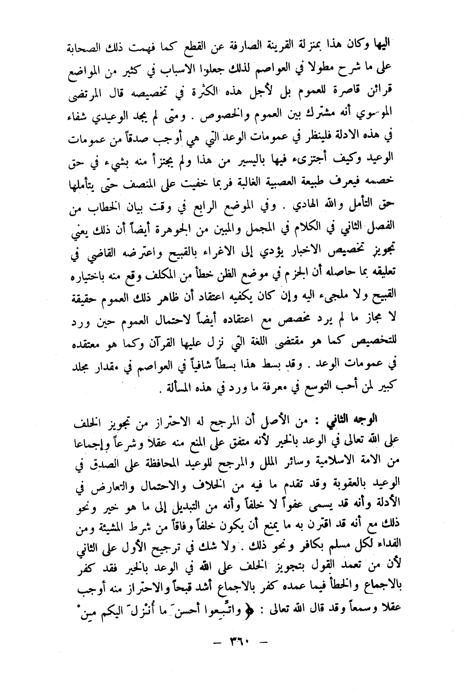 اليها وَكَانَ هَذَا بِمَنْزِلَة الْقَرِينَة الصارفة عَن الْقطع كَمَا فهمت ذَلِك الصَّحَابَة على مَا شرح مطولا فِي العواصم لذَلِك جعلُوا الاسباب فِي كثير من الْمَوَاضِع قَرَائِن قَاصِرَة للْعُمُوم بل لأجل هَذِه الْكَثْرَة فِي تَخْصِيصه قَالَ المرتضى الموسوي أَنه مُشْتَرك بَين الْعُمُوم وَالْخُصُوص وَمَتى لم يجد الوعيدي شِفَاء فِي هَذِه الادلة فَلْينْظر فِي عمومات الْوَعْد الَّتِي هِيَ أوجب صدقا من عمومات الْوَعيد وَكَيف أجتزئ فِيهَا باليسير من هَذَا وَلم يجتزأ مِنْهُ بِشَيْء فِي حق خَصمه فَيعرف طبيعة العصبية الْغَالِبَة فَرُبمَا خفيت على الْمنصف حَتَّى يَتَأَمَّلهَا حق التَّأَمُّل وَالله الْهَادِي وَفِي الْموضع الرَّابِع فِي وَقت بَيَان الْخطاب من الْفَصْل الثَّانِي فِي الْكَلَام فِي الْمُجْمل والمبين من الْجَوْهَرَة أَيْضا أَن ذَلِك يَعْنِي تَجْوِيز تَخْصِيص الاخبار يُؤَدِّي إِلَى الاغراء بالقبيح وَاعْتَرضهُ القَاضِي فِي تَعْلِيقه بِمَا حَاصله أَن الْجَزْم فِي مَوضِع الظَّن خطأ من الْمُكَلف وَقع مِنْهُ بِاخْتِيَارِهِ الْقَبِيح وَلَا ملجئ اليه وَإِن كَانَ يَكْفِيهِ اعْتِقَاد أَن ظَاهر ذَلِك الْعُمُوم حَقِيقَة لَا مجَاز مَا لم يرد مُخَصص مَعَ اعْتِقَاده أَيْضا لاحْتِمَال الْعُمُوم حِين ورد للتخصيص كَمَا هُوَ مُقْتَضى اللُّغَة الَّتِي نزل علها الْقُرْآن وكما هُوَ معتقده فِي عمومات الْوَعْد وَقد بسط هَذَا بسطا شافيا فِي العواصم فِي مِقْدَار مُجَلد كَبِير لمن أحب التَّوَسُّع فِي معرفَة مَا ورد فِي هَذِه الْمَسْأَلَة