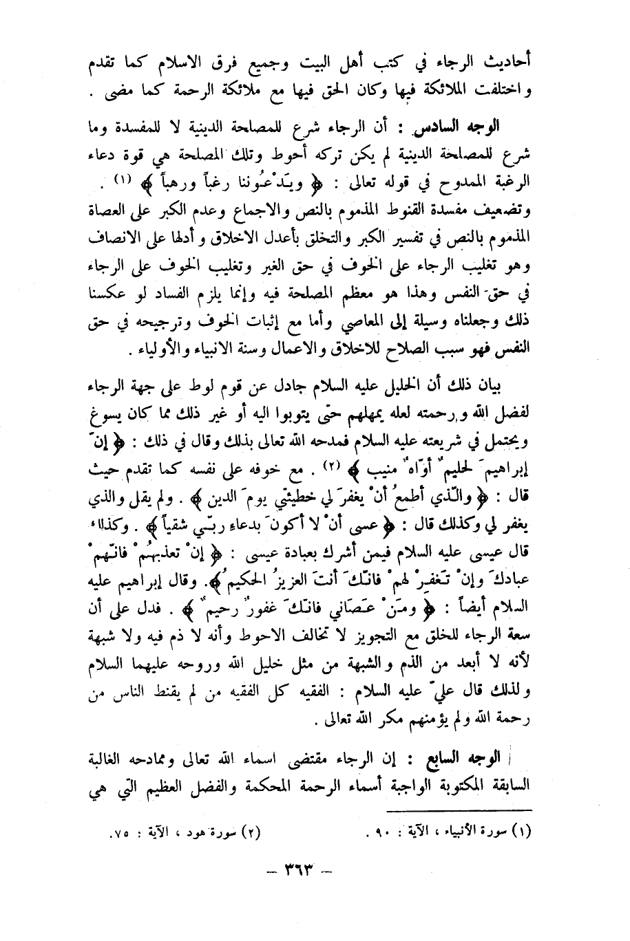 بَيَان ذَلِك أَن الْخَلِيل عَلَيْهِ السَّلَام جادل عَن قوم لوط على جِهَة الرَّجَاء لفضل الله وَرَحمته لَعَلَّه يمهلهم حَتَّى يتوبوا اليه أَو غير ذَلِك مِمَّا كَانَ يسوغ وَيحْتَمل فِي شَرِيعَته عَلَيْهِ السَّلَام فمدحه الله تَعَالَى بذلك وَقَالَ فِي ذَلِك {إِن إِبْرَاهِيم لحليم أَواه منيب} مَعَ خَوفه على نَفسه كَمَا تقدم حَيْثُ قَالَ {وَالَّذِي أطمع أَن يغْفر لي خطيئتي يَوْم الدّين} وَلم يقل وَالَّذِي يغْفر لي وَكَذَلِكَ قَالَ {عَسى أَلا أكون بِدُعَاء رَبِّي شقيا} وكذالك قَالَ عِيسَى عَلَيْهِ السَّلَام فِيمَن أشرك بِعبَادة عِيسَى {إِن تُعَذبهُمْ فَإِنَّهُم عِبَادك وَإِن تغْفر لَهُم فَإنَّك أَنْت الْعَزِيز الْحَكِيم} وَقَالَ إِبْرَاهِيم عَلَيْهِ السَّلَام أَيْضا {وَمن عَصَانِي فَإنَّك غَفُور رَحِيم} فَدلَّ على أَن سَعَة الرَّجَاء لِلْخلقِ مَعَ التجويز لَا تخَالف الاحوط وَأَنه لَا ذمّ فِيهِ وَلَا شُبْهَة لِأَنَّهُ لَا أبعد من الذَّم والشبهة من مثل خَلِيل الله وروحه عَلَيْهِمَا السَّلَام وَلذَلِك قَالَ عَليّ عَلَيْهِ السَّلَام الْفَقِيه كل الْفَقِيه من لم يقنط النَّاس من رَحْمَة الله وَلم يؤمنهم مكر الله تَعَالَى