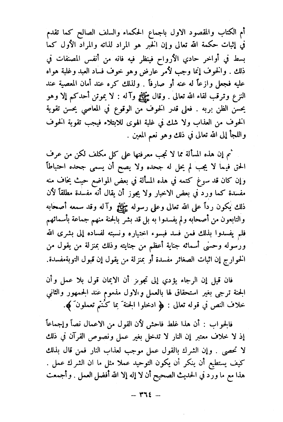 أم الْكتاب وَالْمَقْصُود الأول باجماع الْحُكَمَاء وَالسَّلَف الصَّالح كَمَا تقدم فِي إِثْبَات حِكْمَة الله تَعَالَى وَإِن الْخَبَر هُوَ المُرَاد لذاته وَالْمرَاد الأول كَمَا بسط فِي أَوَاخِر حادي الْأَرْوَاح فَينْظر فِيهِ فانه من أنفس المصنفات فِي ذَلِك وَالْخَوْف إِنَّمَا وَجب لأمر عَارض وَهُوَ خوف فَسَاد العَبْد وَغَلَبَة هَوَاهُ عَلَيْهِ فَجعل وازعا لَهُ عَنهُ أَو صارفا وَلذَلِك كره عِنْد أَمَان الْمعْصِيَة عِنْد النزع وترقب لِقَاء الله تَعَالَى وَقَالَ صلى الله عَلَيْهِ وَسلم وَآله لَا يموتن أحدكُم إِلَّا وَهُوَ يحسن الظَّن بربه فعلى قدر الْخَوْف من الْوُقُوع فِي الْمعاصِي يحسن تَقْوِيَة الْخَوْف من الْعَذَاب وَلَا شكّ فِي غَلَبَة الْهوى للابتلاء فَيجب تَقْوِيَة الْخَوْف واللجأ إِلَيّ الله تَعَالَى فِي ذَلِك وَهُوَ نعم الْمعِين
